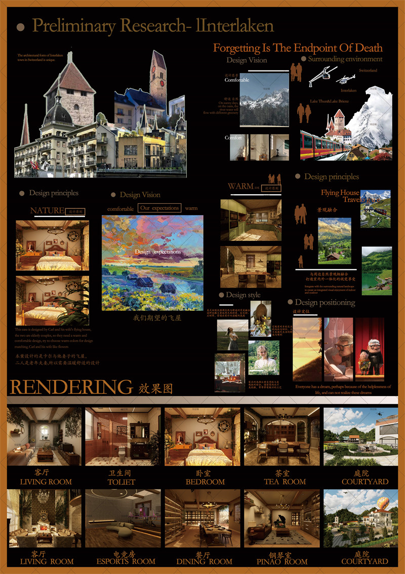 首先从电影飞屋环游记中获得灵感,想要打造一个兼具舒适美观与功能性的梦想,植物融合,现代简约与独特艺术元素,展现主人的个性品位之屋,打造与周边自然景观相融合室内外一体化的视觉享受之屋。空间要以生活方式为核心考虑居住者的生活习惯和日常活动,注重空间的连贯性和流动性,体现居住者的个人风格和喜好。本身瑞士这个国家就是一个浪漫生活的国度,加上在这个小镇风景优美,人们都享受生活。本案设计理念要以人为本,设计要贴合居住者的需求融合自然强调与自然的接触,可以通过引入自然元素,在室内设置绿植墙,采用大量的落地窗,让居住者能欣赏到室外的花园,泳池等景观文化与艺术结合体现文化内涵和艺术美感,从建筑风格本身出发,加之与之匹配的文化元素。空间布局要让人感到舒适,自在合理安排家具的尺寸和摆放位置,保证有足够的活动空间,通过不同的材料,色彩高度来营造空间的层次感,融入智能家具系统提升生活品质,包括智能灯光控制可根据不同场景,调节亮度和颜色智能窗帘能定时开合或远程控制,等等。植物大多采用本地的乡土植物,更能与设计相融合。本案设计的风格是美式田园风格,强调自然与舒适的完美融合,采用大量的天然材质,营造出质朴而温暖氛氛围在色彩方面多采用柔和,且贴近自然的色调,如米白色浅黄色等给人一种宁静祥和的感觉家具的选择注重实用性与美观性的结合造型简约,而不是优雅。强调的是一种悠闲自在的生活态度,让居住者在繁忙生活中能够找到一方宁静的港湾。本案设计既有对乡村生活的向往与回归,又不失现代生活的舒适与便利。