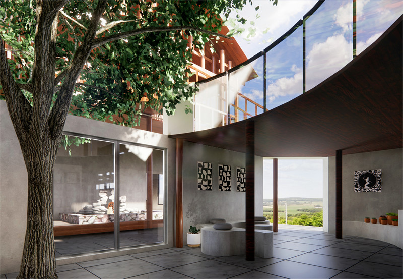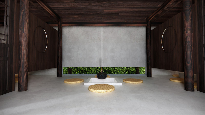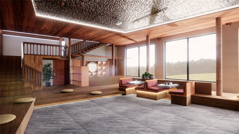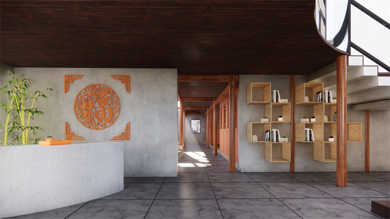 6.作品效果展示:项目在空间布局上呈现出开阔、通透的效果,通过材质和色彩的合理搭配,营造了一个自然朴素的环境。例如,旧房中的文化区和休息区,采用了黑、白、灰、原木色为主的配色,以凸显安化黑茶文化的历史厚重感。新房则在现代感中融入了中式元素,通过大面积的木质材料营造温馨的居住氛围。