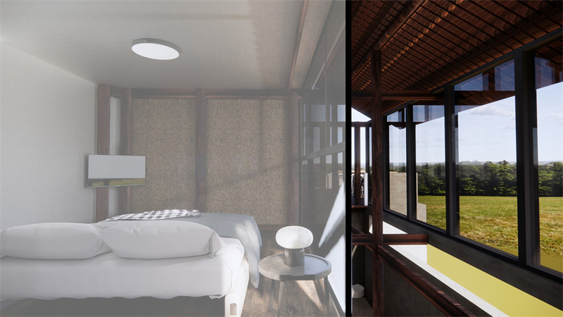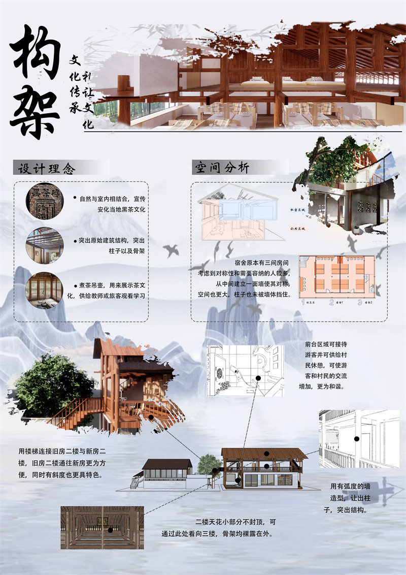5.场地分析:安化县作为黑茶文化的发源地,有着深厚的文化底蕴。设计选址位于大安溪乡,周边环境清幽,适合学生及游客学习、体验当地文化。原始建筑为传统木结构,具备良好的空间基础,适合开展设计改造。在场地选择上,设计团队将原有建筑分为两部分:一栋旧建筑作为文化展示区,另一栋新建筑作为住宿与学习区,功能分布明确且互不干扰。
