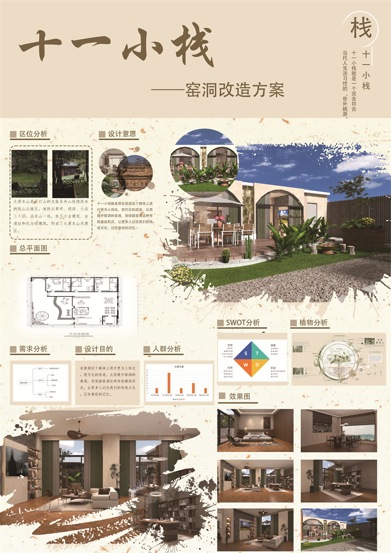 十一小栈是在山西特色建筑“窑洞”的基础上进行改造,窑洞是中国北部黄土高原上居民的古老居住形式。在建筑学上属于生土建筑,其特点就是人与自然和睦相处、共生,简单易修、省材省料,坚固耐用,冬暖夏凉。传统的窑洞空间从外观上看是圆拱形,虽然很普通,但是在单调的黄土为背景的情况下,圆弧形更显得轻巧而活泼,这种源自自然的形式,不仅体现了传统思想里天圆地方的理念,同时更重要的是门洞处高高的圆拱加上高窗,在冬天的时候可以使阳光进一步深入到窑洞的内侧,从而可以充分的利用太阳辐射,而内部空间也因为是拱形的,加大了内部的竖向空间,使人们感觉开敞舒适。窑洞冬暖夏凉,住着舒适,节能,同时传统的空间又渗透着与自然的和谐,朴素的外观在建筑美学上也是别具匠心。但是随着经济的发展,窑洞的废弃越来越多,有不少人儿时窑洞的记忆逐渐消散,十一小栈就是想在窑洞这个载体上进行更为人性化,现代化的改造,从而提升窑洞的美观,但保留窑洞这种传统建筑形式,让更多人记住我们的传统文化,记住曾经的记忆。窑洞最大的缺点就是采光不足,我把整个向阳面全部由原先的泥砖结构改为落地玻璃,这样充分接纳了阳光,小院内多种植绿植,与自然亲近,十一小栈就是一个完全符合当代人生活习性的“世外桃源”