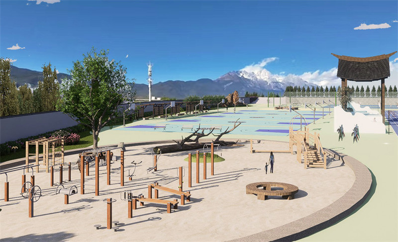 设计灵感源于丽江本地的玉龙雪山、黑龙潭等美丽的自然景观。设计中汲取了这些景观的形态、色彩、纹理等元素,通过绿化设计、借景造景的手法力求将大自然的美景融入到每一个细节中,使空间充满生机和自然韵味。 同时结合等丽江本地历史文化、传统建筑、民俗风情元素,提取其独特符号、图腾、色彩进行再设计,融入文化墙、艺术装置等元素,增强空间的文化氛围和历史感。例如,设置文化展示板、将瓦猫等纹样融入体育设施之中,让人们在使用空间的同时,感受到深厚的文化积淀使空间既具现代感又不失文化底蕴。