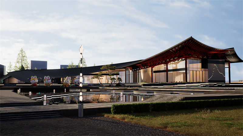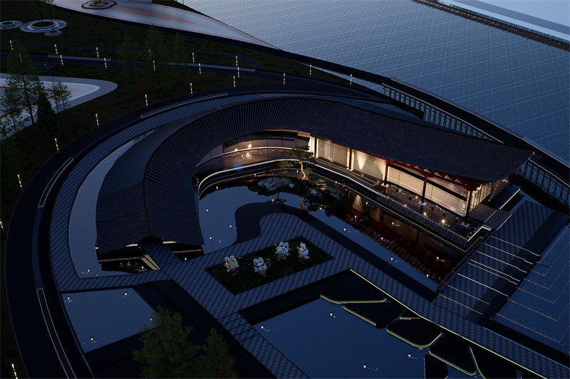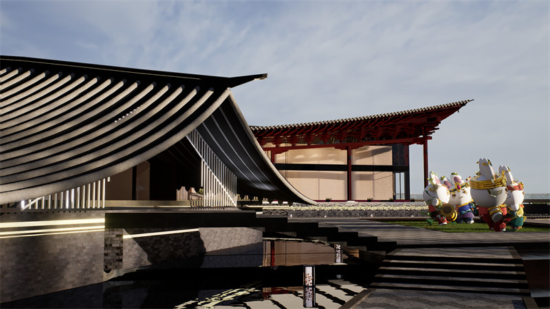 构筑物整体形象灵感来源于敦煌沙漠的沙丘,融合了自然与建筑之美,流线型外观还寓意着沙漠般的生命力。我们提取莫高窟的九层楼上的建筑特色与结构,将其造型夸张化再运用在构筑物的各个部分。