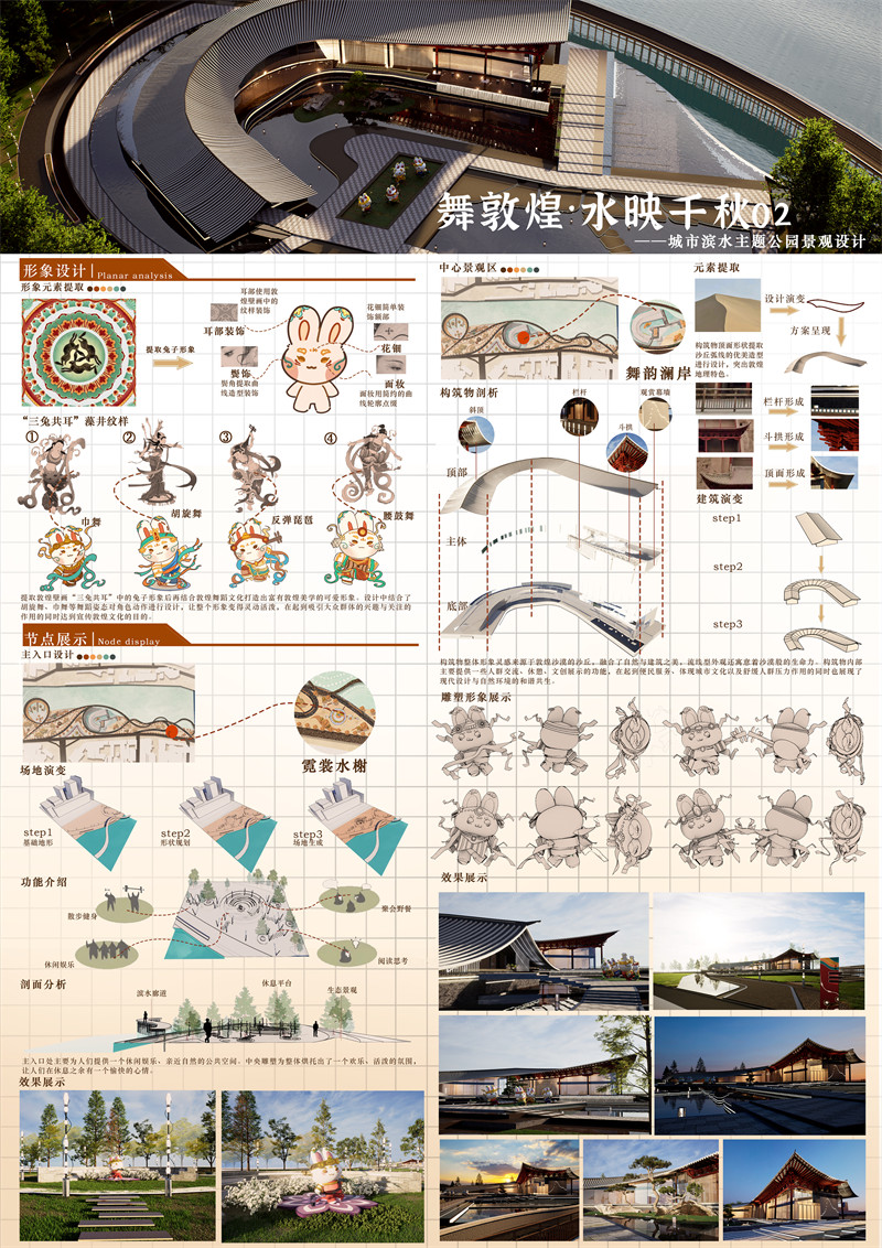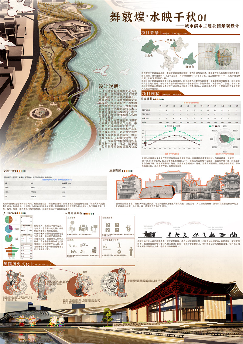 设计理念及思路: 本项目旨在将敦煌壁画中的舞蹈元素与现代城市滨水公园设计理念相结合,打造一个既富有历史文化底蕴又充满现代活力的城市滨水公园。通过提取敦煌壁画中舞蹈的形态特点、服饰花纹、舞者首饰与飘带等元素融入公园景观设计中,展现敦煌艺术的独特魅力。因为项目选址在敦煌市市区正中心,我们希望项目可以在改善城市生态环境的同时传承、展示城市文化。