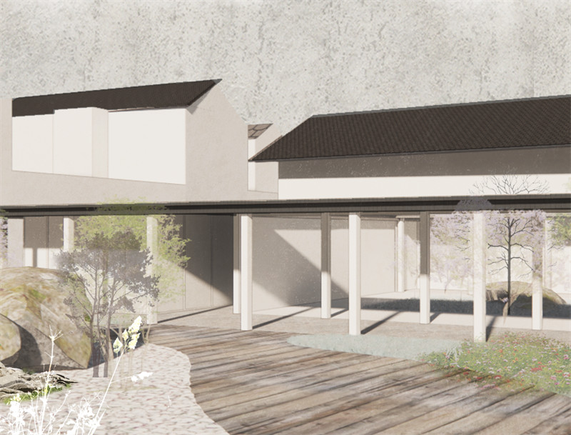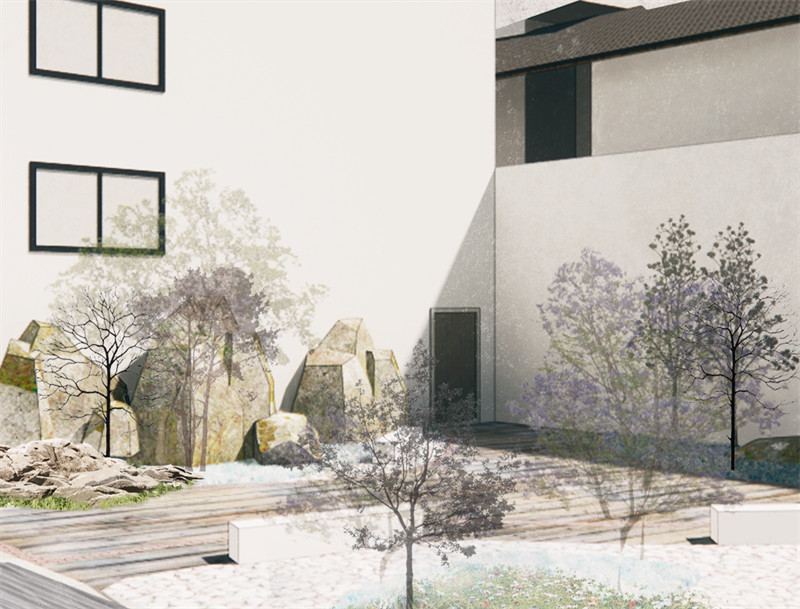 园外方景以围合型廊道为核心,巧妙勾勒出一方静谧而深邃的空间。廊道如优雅的丝带,轻盈环绕,既界定了空间的边界,又引领着视觉与步履的流动。廊外,精心布置的小片园林景观,错落有致,绿意盎然,与廊道的古朴雅致相得益彰。围合形廊道疏散有序的镂空,使内部的生活事件可以漫溢到生活领域,促进区块的多孔性与活化,吸引人们的关注与兴致,从而产生更多的可能性。
