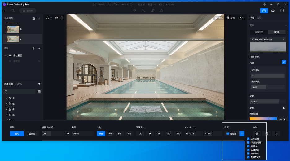 在完成场景设计后,在渲染输出界面可以勾选通道图选项,可以在设置栏中勾选需要的通道图进行渲染,导出图片的同时,D5也会导出通道图用作后期处理。
