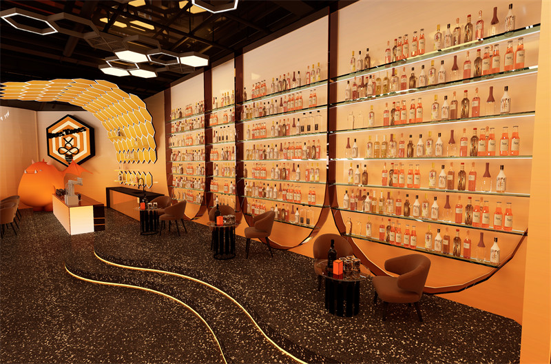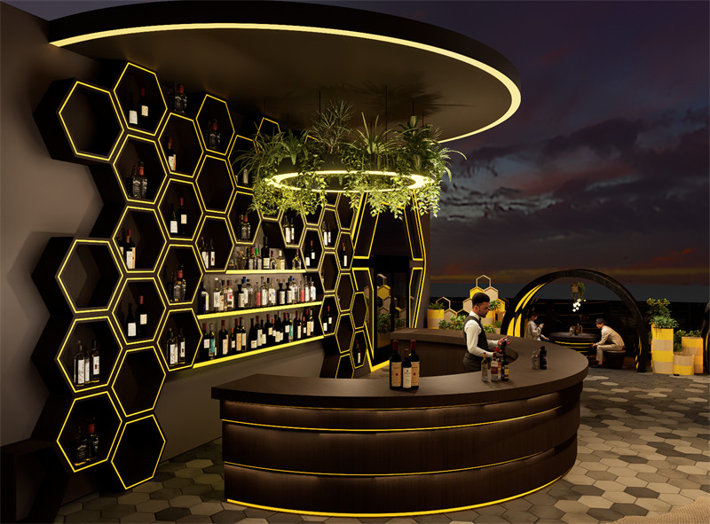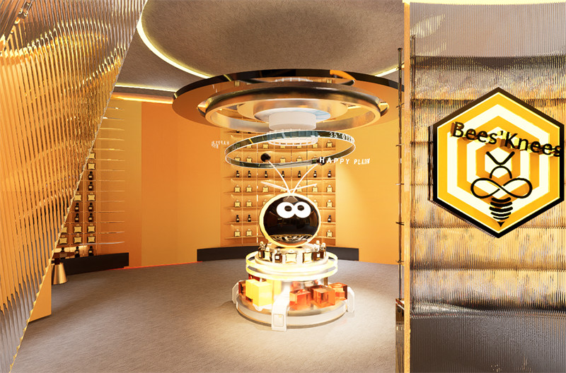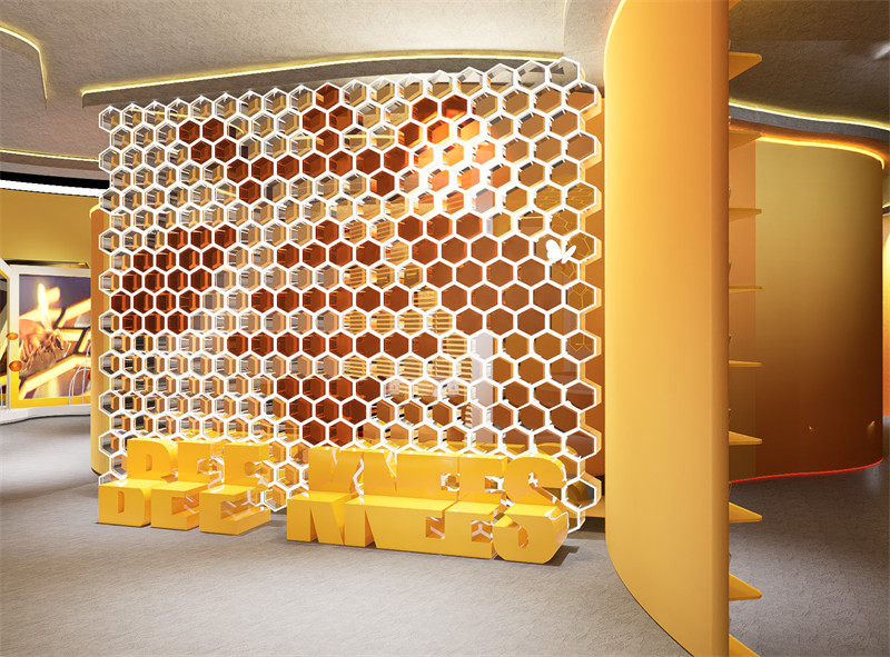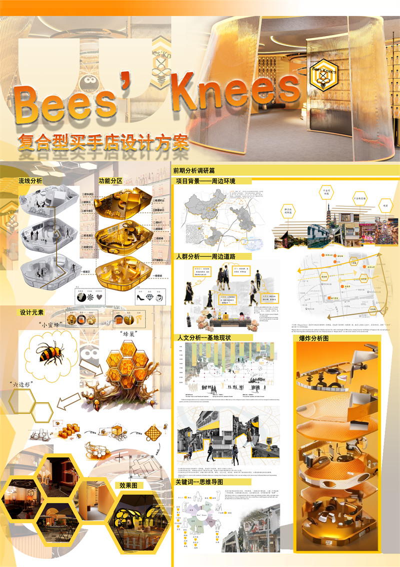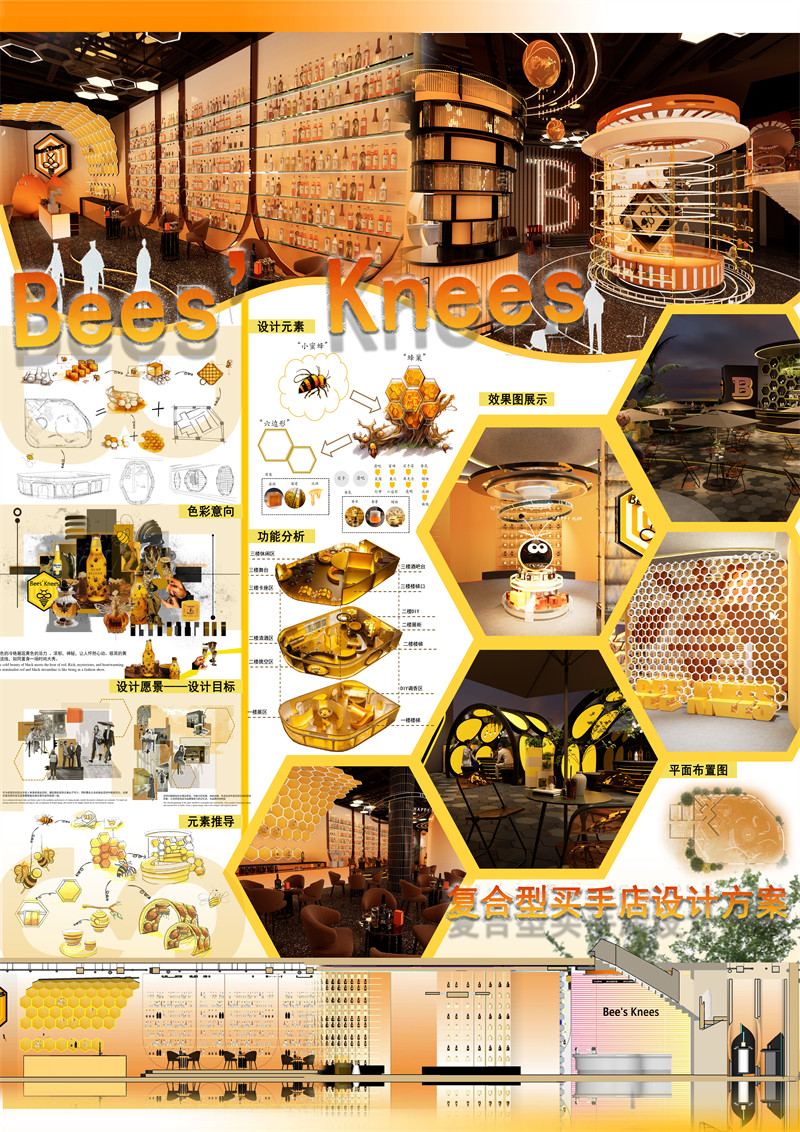 3.设计理念及思路:在这个设计元素中,蜜蜂和蜂巢成为了引人注目的焦点。蜜蜂在柔和的阳光下忙碌地飞舞着,它们的翅膀在空中轻盈地振动,散发出微弱的金色光芒。蜂巢则是一片工整而充满活力的结构,由无数个六边形小房间组成,仿佛是大自然的建筑奇迹。蜂巢中忙碌的蜜蜂不断进出,带着丰富的花粉和甜美的芳香。整个设计元素充满了生机和活力,展现了蜜蜂勤劳、有条不紊的工作场景,以及蜂巢独特的几何美感和秩序感。整个设计以“蜜蜂”为灵感,创作出一个独属于Bees’Knees的复合型买手店铺。