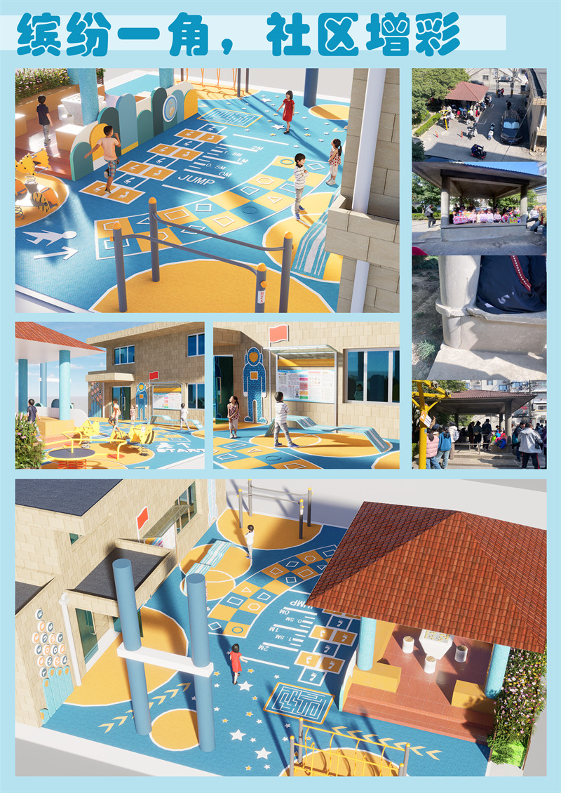 在上海市嘉定区嘉邦小区内,有一片原本较为简陋且存在安全隐患的公共区域,该区域围绕着一座水泥亭展开。为了提高居民的生活品质,特别是为儿童创造一个充满活力与乐趣的成长环境,同时满足不同年龄段居民对于休闲、健身及社交活动的需求,计划将这片区域改造成为一个集亲子互动、休闲娱乐于一体的多功能空间。此项目的核心理念是“缤纷一角,社区增彩”,旨在通过色彩丰富、功能多样的设计来美化居住环境,增强邻里间的联系,促进家庭和谐以及个人身心健康的发展。