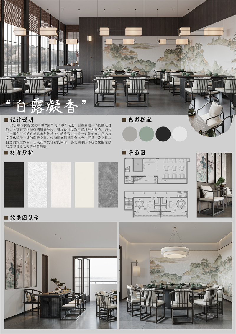 该作品以“露”与“香”为核心元素的新中式餐厅设计:在快速发展的现代社会中,人们对于生活品质的追求日益提升,餐饮空间不再仅仅是满足口腹之欲的场所,更成为了人们体验文化、享受情感交流的重要空间。在此背景下,本次餐厅设计旨在通过“微更新”理念,将传统与现代、自然与文化巧妙融合,以“露”与“香”为核心元素,打造一处既贴近自然、又富有文化底蕴的新中式用餐环境,让空间焕发出新的活力,为顾客带来一次难忘的文化与自然深度体验。