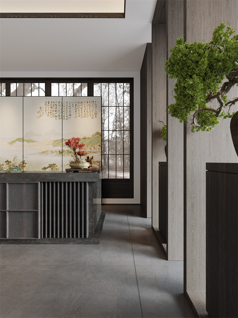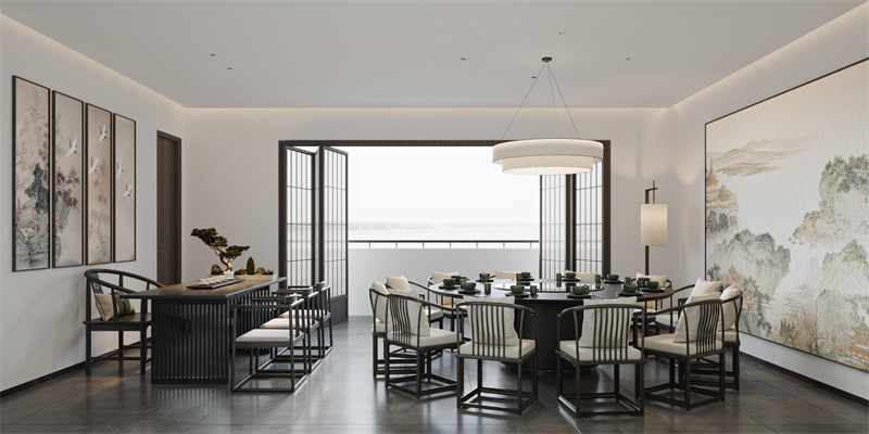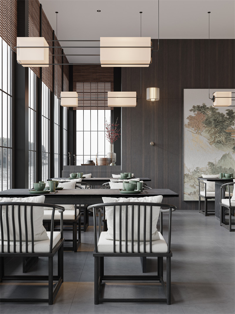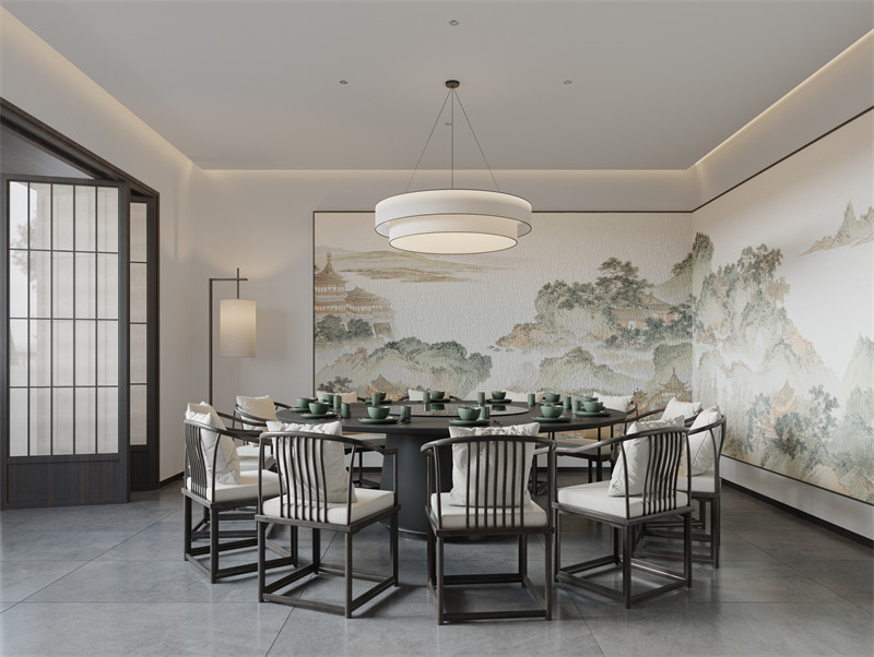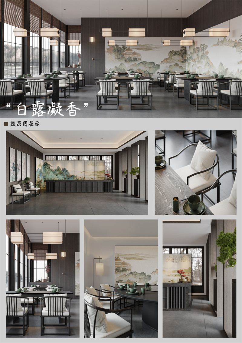 空间布局:自然流动,虚实相生。开放式入口与庭院设计:借鉴中国传统园林的“借景”手法,餐厅入口处设计为开放式,引入自然光线与室外绿植,仿佛一道通往自然世界的门户。内部设置小型庭院,以水池、假山、竹林等元素模拟“白露”时节的自然景观,既分隔了空间,又增加了空间的层次感与流动感。灵活多变的用餐区域:根据不同顾客群体的需求,餐厅内部划分为多个功能区,如半开放式包间、私密性强的雅座以及面向庭院的开放式座位。通过可移动的隔断、屏风等设计,实现空间的灵活转换,满足不同场景下的用餐需求。