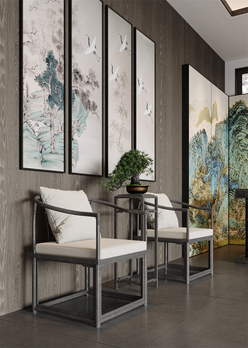 材料与色彩:自然质朴,雅致和谐。自然材料的运用:选用竹、木、石材等自然材料作为主要装饰元素,不仅符合“露”与“自然”的主题,也体现了新中式风格追求的简约与质朴。包间墙面采用淡雅的米白色或浅灰色涂料,地面铺设仿古地砖,营造出一种温馨而又不失高雅的氛围。色彩搭配与光影效果:色彩上,以白色、浅木色为主基调,辅以绿色植物点缀,营造出清新脱俗的空间氛围。利用自然光与人工照明相结合,通过灯光的明暗变化,营造出晨露微光、夕阳西下的不同时间感,增强空间的故事性与情感共鸣。