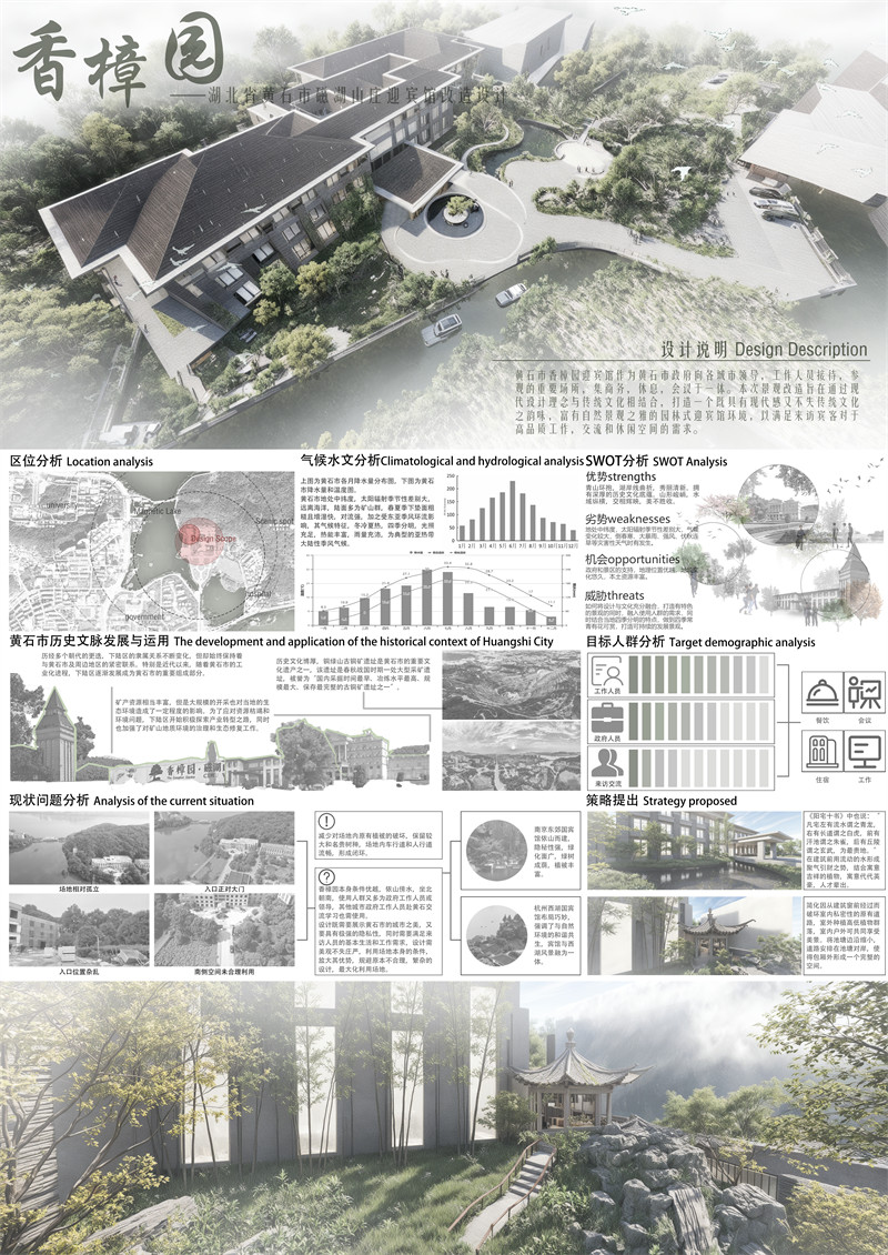 黄石市香樟园迎宾馆作为黄石市政府向各城市领导,工作人员接待,参观的重要场所,集商务,休息,会议于一体。本次景观改造旨在通过现代设计理念与传统文化相结合,打造一个既具有现代感又不失传统文化之韵味,富有自然景观之雅的园林式迎宾馆环境,以满足来访宾客对于高品质工作,交流和休闲空间的需求。