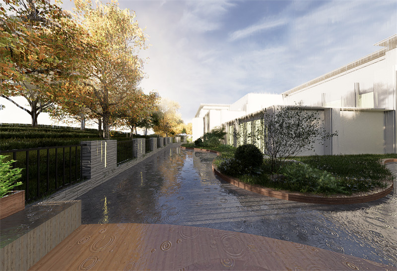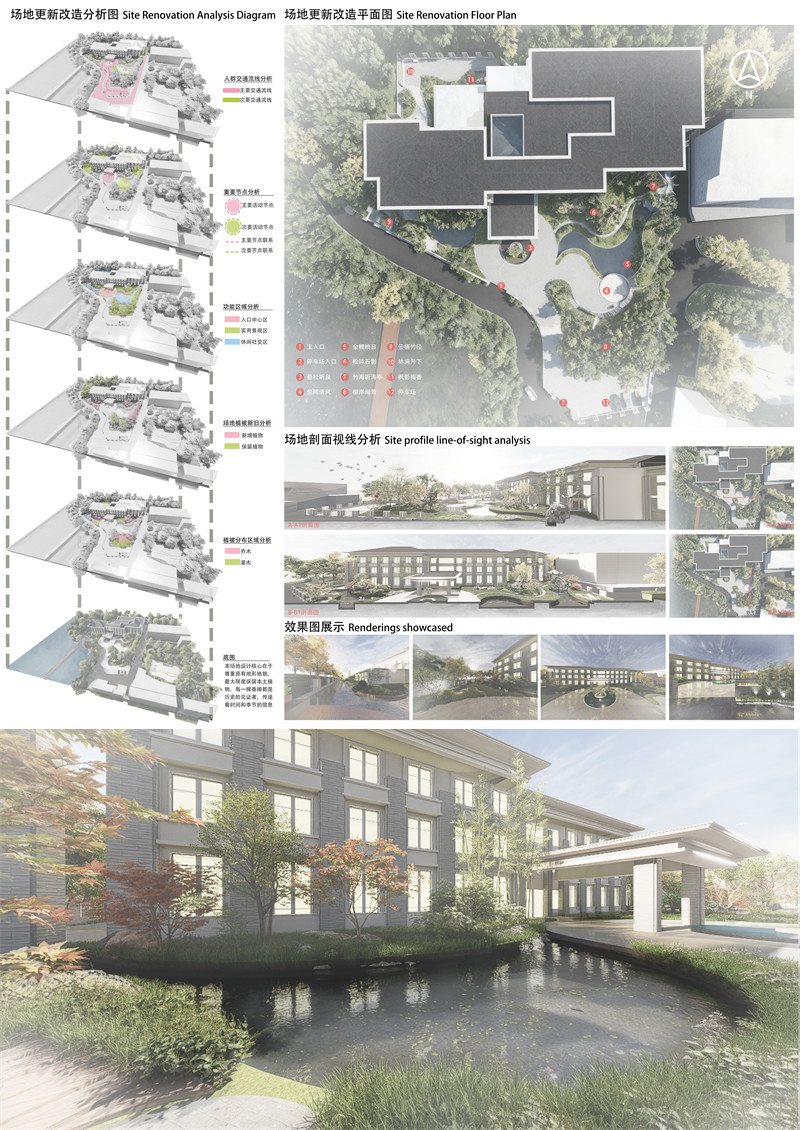 问题1:迎宾馆门口正对大门,一览无余。改造方案:在入口到入户厅中间造曼,形成隔断,起到遮挡作用,同时丰富场地暴观的变化。