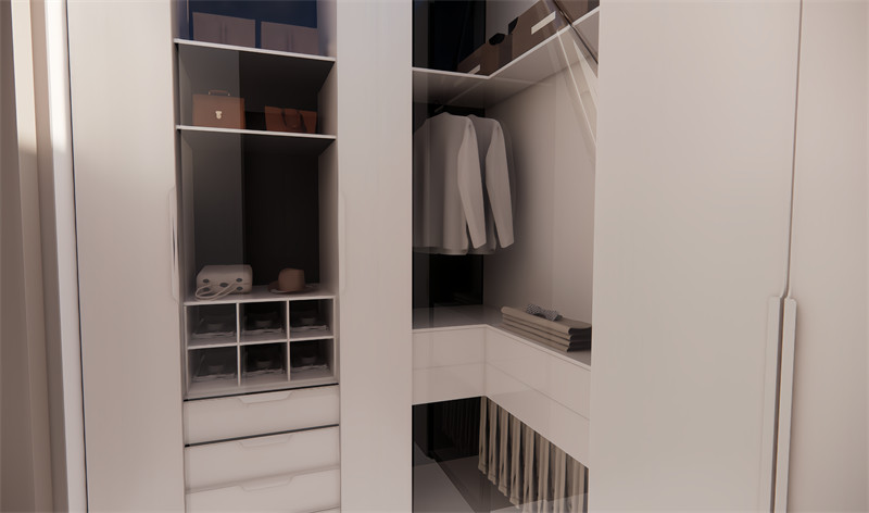 定制衣柜:根据卧室尺寸定制衣柜,充分利用墙体空间,内部布局考虑衣物分类存放,如长衣区、短衣区、折叠区及抽屉等。