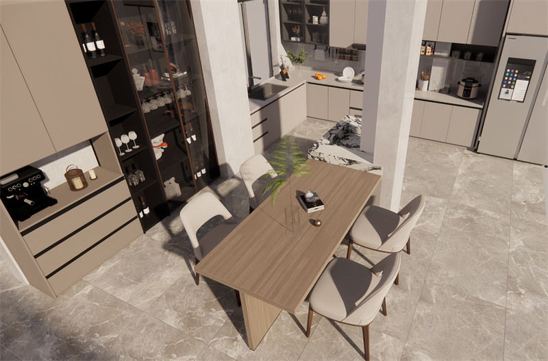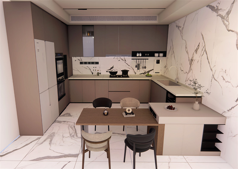 功能区域:明确划分烹饪区、洗涤区、储物区及备餐区,形成流畅的“工作三角”,提高工作效率。烹饪区靠近烟道,洗涤区靠近水源,储物区则充分利用墙面空间安装吊柜,备餐区设在中央,便于食材处理。
