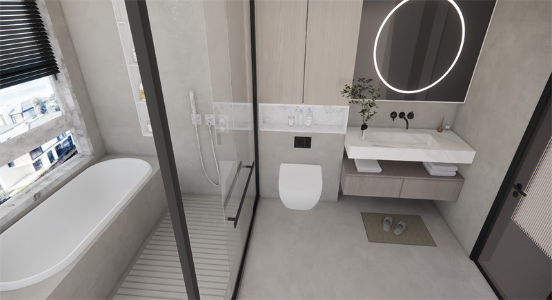 风格:选择现代简约风格,以白色和浅灰色为主色调,搭配木质地板或仿木纹瓷砖,营造温馨而不失高雅的氛围。家具线条简洁流畅,适当融入金属或玻璃元素,提升整体格调。