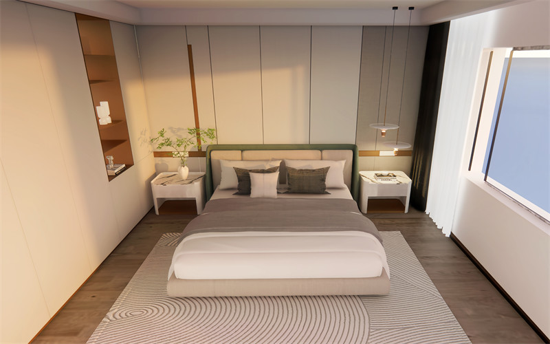 舒适度:卧室注重营造宁静舒适的休憩环境。床的位置应远离门窗,避免噪扰,床头背景墙可采用软包或壁纸增加温馨感。配置可调节亮度的台灯,便于夜间阅读。