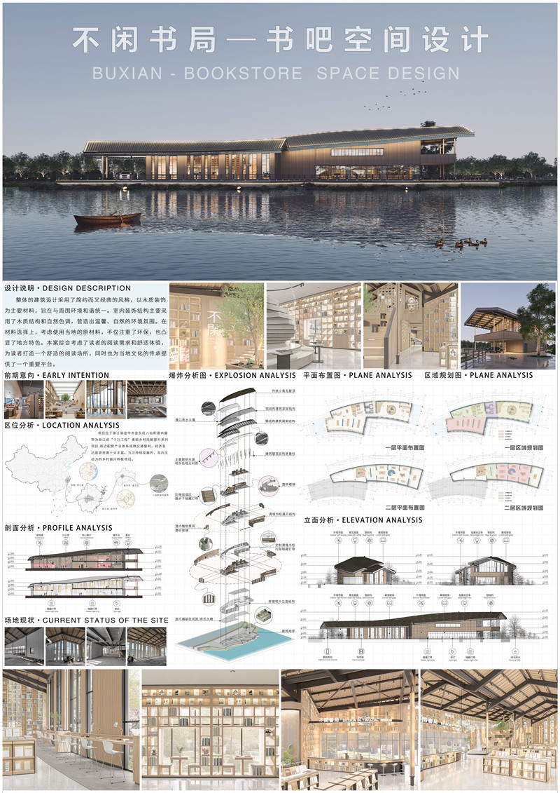 2.作品名:《不闲书局 – 书吧空间设计》。