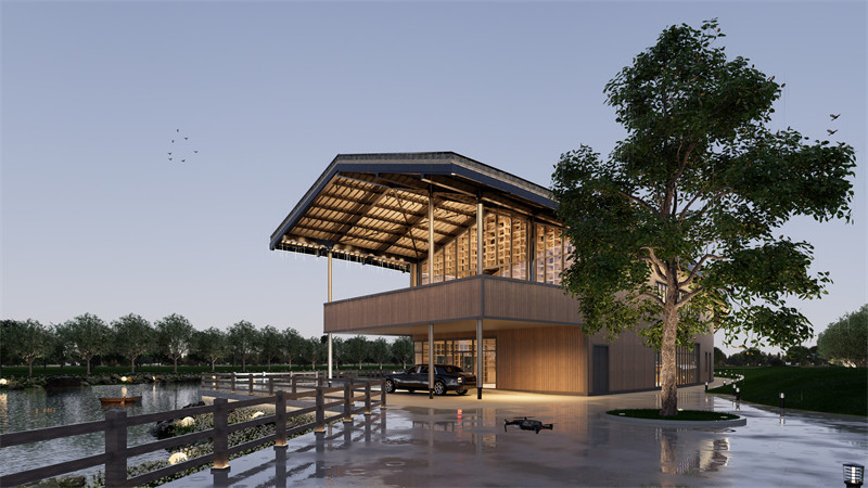 方案设计的是一幢独栋建筑,建筑的造型大致是两个坡屋顶的建筑进行交叉后再进行弯曲的形态,整个建筑是以传统与现代风格的结合,建筑整体以钢结构为支撑,并搭配木质结构进行建造。屋面采用传统而富有质感的小青瓦,建筑的整个外围护结构饰面是木板条和幕墙玻璃的搭配。室内空间选用了现代原木风格作为室内空间设计的主要风格,目的在于与建筑质感进行统一。空间内采用了大面积的原木材质并选用了温和沉稳的的色调,营造出温馨、舒适、自然的室内空间。