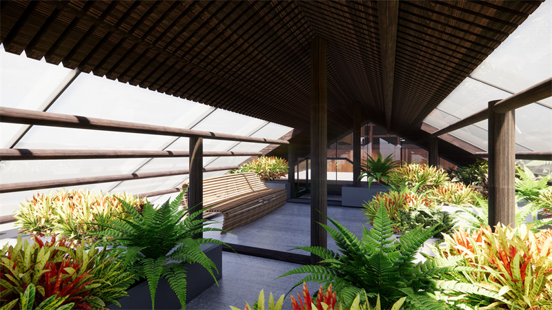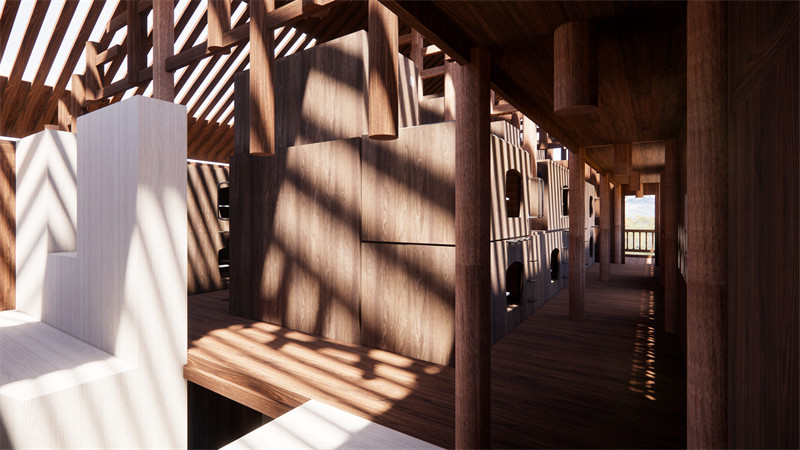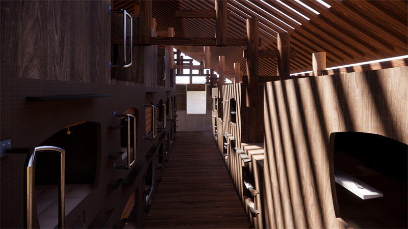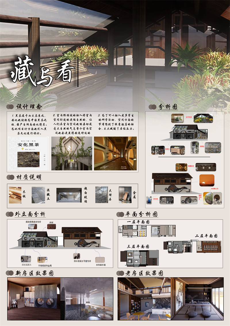 设计理念:黑茶属于七大茶系之,安化也被称为中国黑茶之祖,因产自湖南安化得名。为此项目设计方面也引入黑茶文化进行设计。室内跟植被的融入将室内空间打造的更偏自然的,让人们在室内空间也能亲切感受大自然的气息整个室内空间也会更显得安逸舒适的。为了可以融入更多学生的研学活动,空间方面的节省想到了胶囊酒店的融合,大大减缓了居住压力。