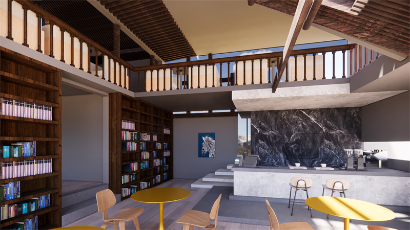 旧房设计:老师生活区+对外开放区。一楼区为对外开放区,含前台,茶室,书吧,二楼为老师生活区。