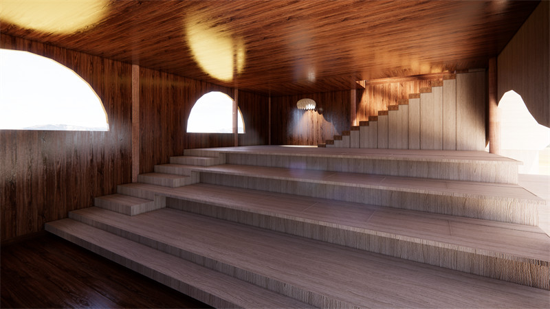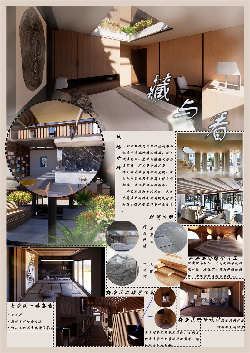 新房区:阶梯设计以胶囊风形式设计增加空间容量。阶梯学习区以胶囊理念融入,与对面阶梯设计做对称,座位下方可打开做储物柜,方便学生调研学习储物。隐藏书吧以现代风隐藏于阶梯建筑下方(休息区)地面用石子铺贴地面。二楼学生宿舍以学生宿舍采用胶囊理念,方便接纳更多学生到来的住宿需求,隐私性也相对较好。