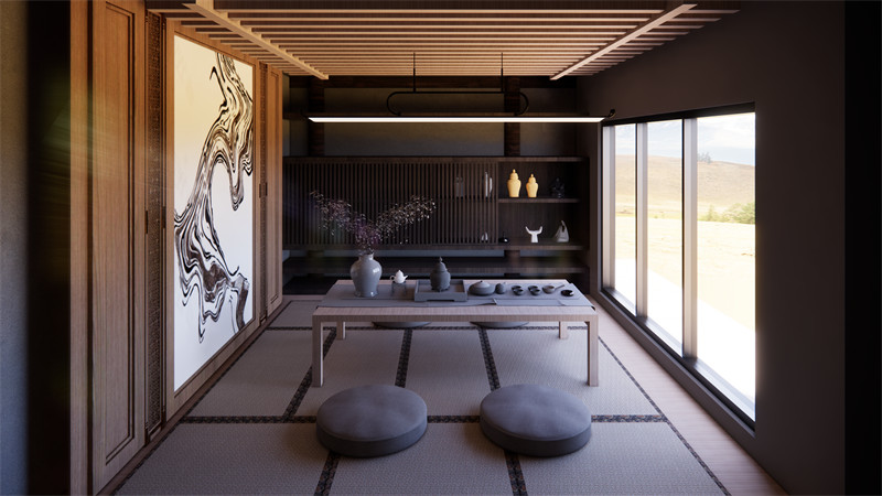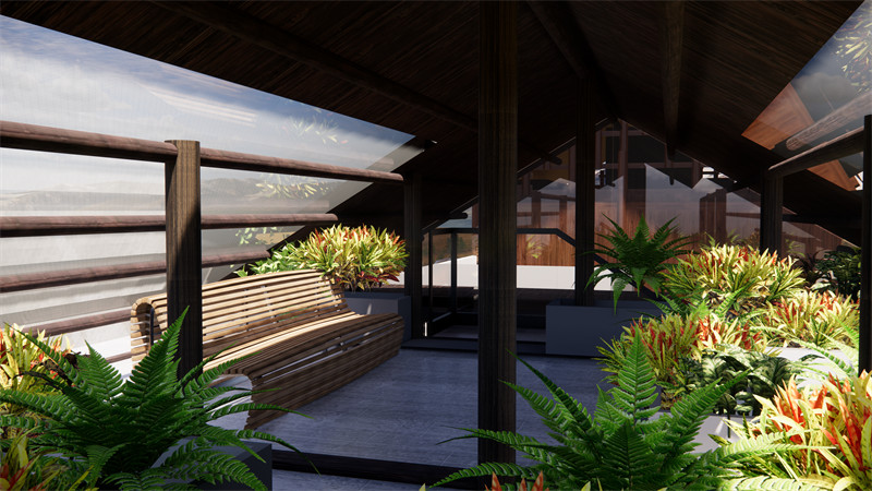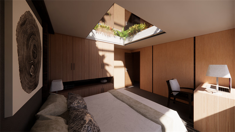 老房区:一楼茶室以日式风,整体木质结构为主,响应当地茶文化开设茶室。二楼卧室以现代风卧室,顶面与阁楼互通采用借景。阁楼花园以阁楼花园为一楼书吧跟二楼卧室做景,室内自然景色更好。