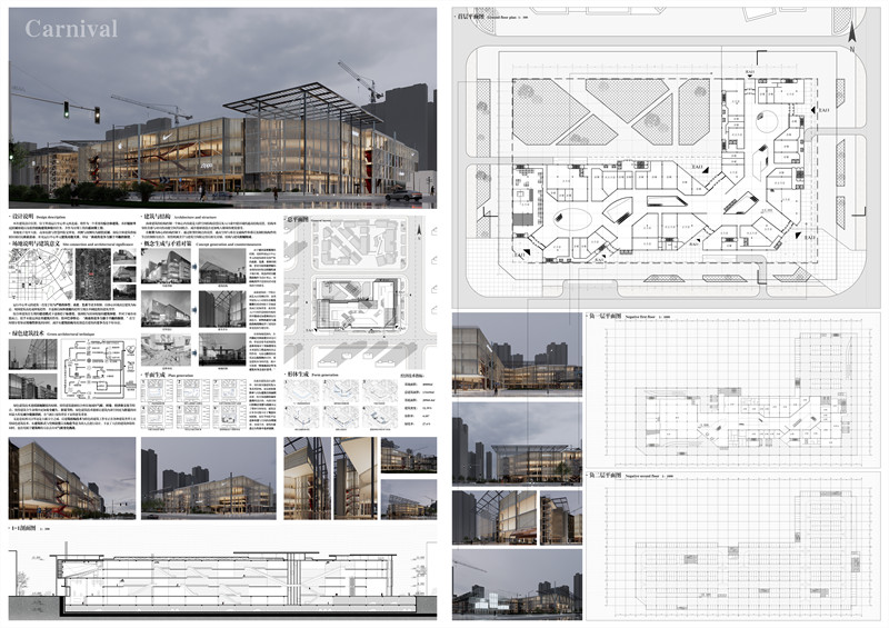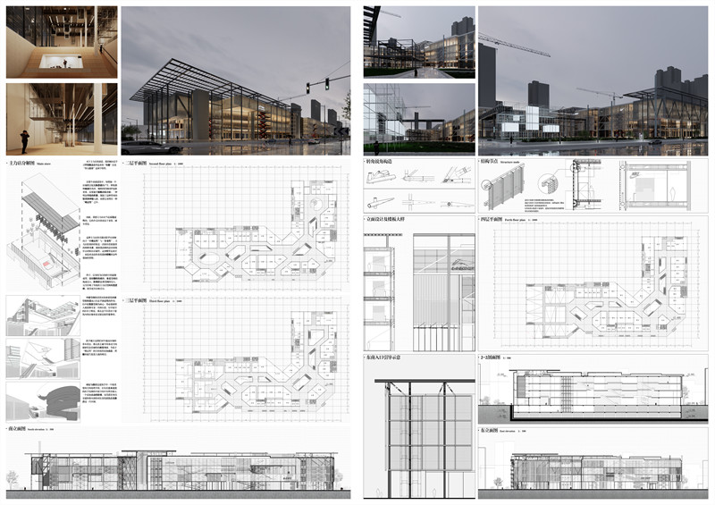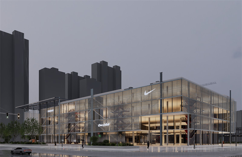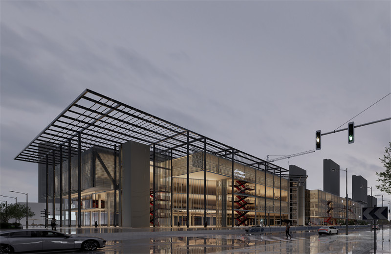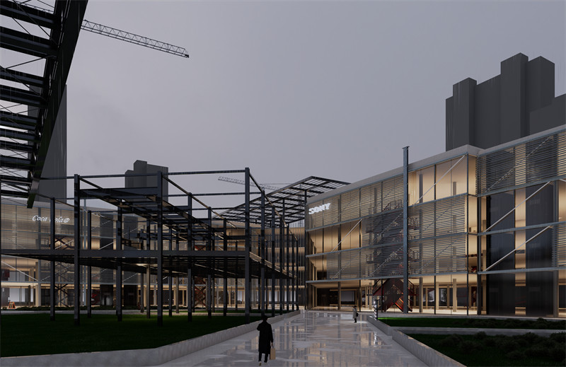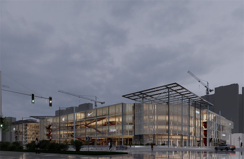 商业建筑的结构控制一个核心内容就是大跨空间结构设置以及入口或中庭区域的通高结构设置,结构本身的美感与对应的功能空间共同组合,或许能够创造出更加吸人眼球的视觉感受。在框架为核心的结构控制下,通过框架控制点的设置、通高空间与乖直交通构件体系以及钢结构构件的节点控制相互结合,使得机械美学与建筑空间限定得以相互穿插,结构与建筑相辅相成。