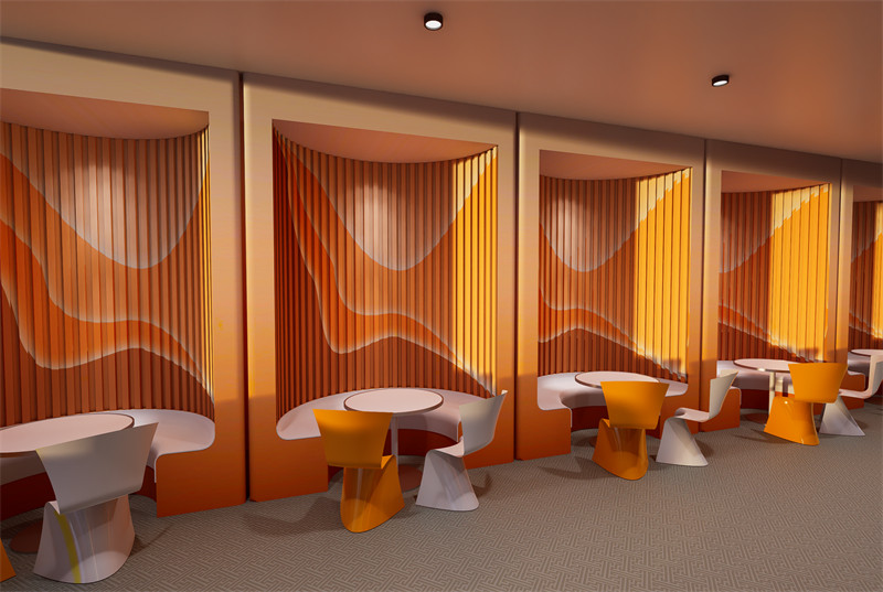 色彩运用:以赤橙黄绿青蓝紫七种颜色为基础,通过渐变的形式融合这些色彩,形成丰富多彩的视觉效果。在天花板、座椅、桌子等空间元素中,巧妙运用这些色彩,使整个空间充满活力和动感。