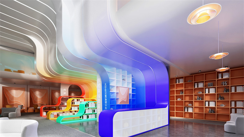 多功能设计:结合大学生的实际需求,设计多功能书区、彩虹卡座等,提供多样化的学习和交流空间。