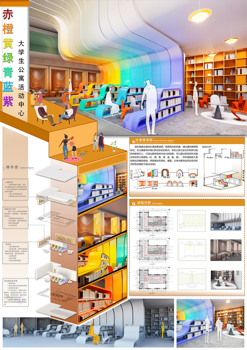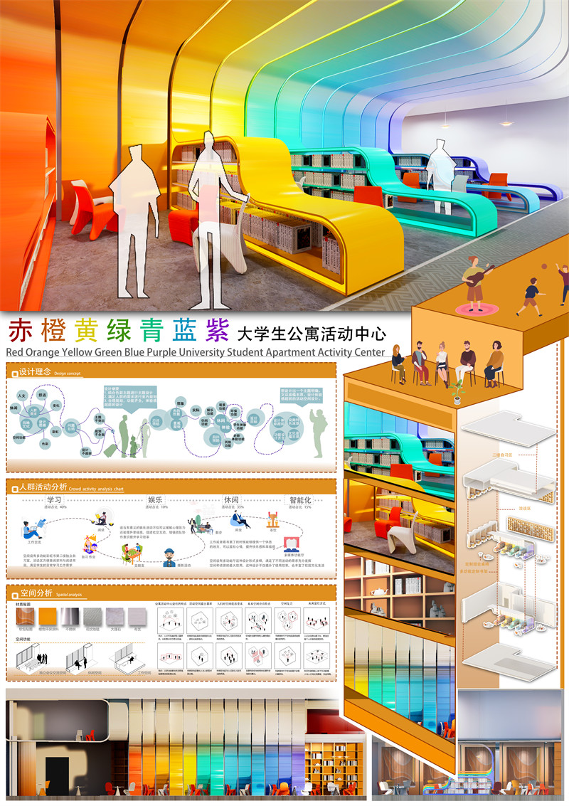 总之,本设计以赤橙黄绿青蓝紫为主题,通过色彩、形态和功能布局等设计元素的巧妙运用,旨在打造一个具有视觉冲击力和实用性的公共空间,以满足大学生的多元化需求。