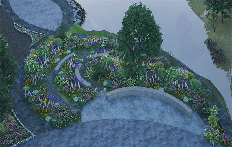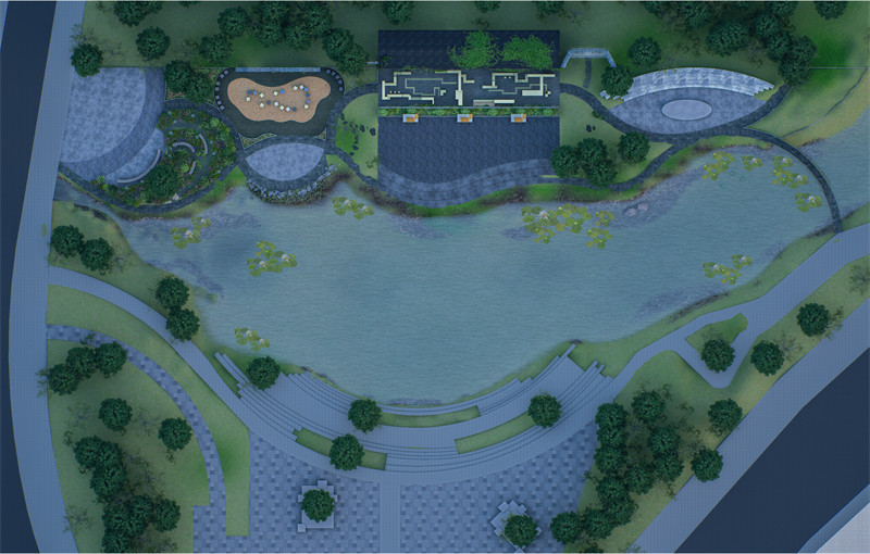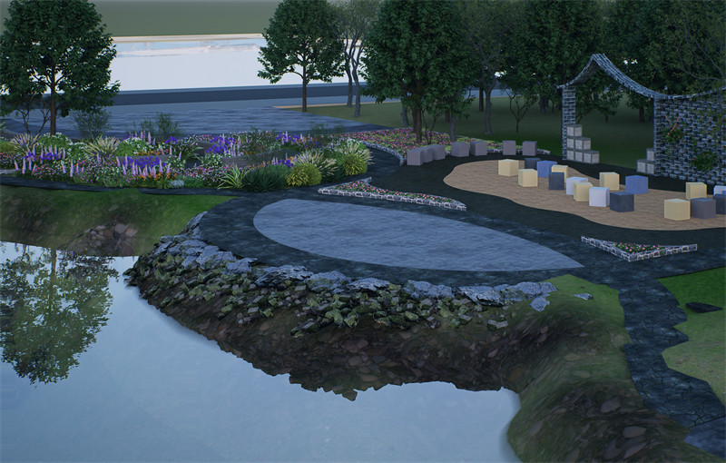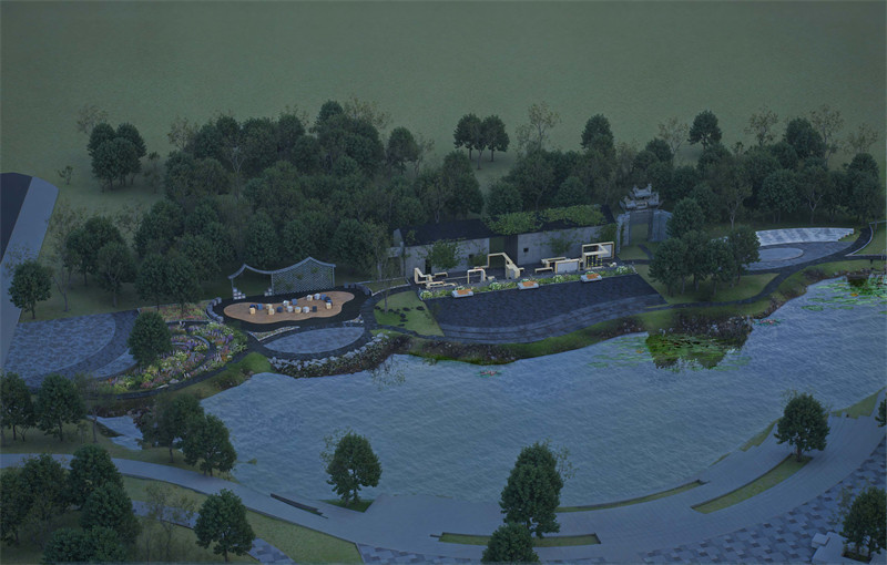 广场主入口附近布置疗愈花园,选用本地耐阴植物及芳香植物,以营造静谧宜人的自然疗愈环境,促进居民身心健康。步道采用祠堂倒塌砖瓦拼接而成,强化场地的历史记忆感。场地沿湖区域设置钓鱼广场和亲水空间,利用原有低洼地形与水系资源,打造灵动的滨水体验区域,为居民提供垂钓、戏水等亲近自然的活动空间。汀步与跌水小景在提升趣味性的同时,也优化了雨水循环系统。另外,为了能够打造一个互动性强的亲子活动区,设计融入传统文化元素,如以祠堂砖瓦砌成的文化墙,绘制当地民俗故事。地面铺装采用安全防滑材料,同时布置休憩座椅,提升区域舒适性与安全性。场地东侧通过小桥将对岸广场与祠堂广场联系起来,同时在祠堂东侧设置老年唱歌活动区,利用祠堂围墙形成天然声场,满足老年群体的社交与娱乐需求,延续传统乡土文化中“唱歌聚会”的社区氛围。设计选用祠堂倒塌的砖瓦为主要材料,通过创新性拼接手法用于汀步、文化墙等构筑物建设,既延续了历史场地记忆,也符合可持续发展的理念。此外,铺装选择本地天然石材,与祠堂风貌自然融合,整体风格古朴而不失精致。