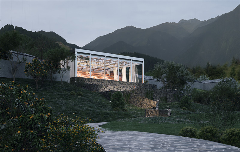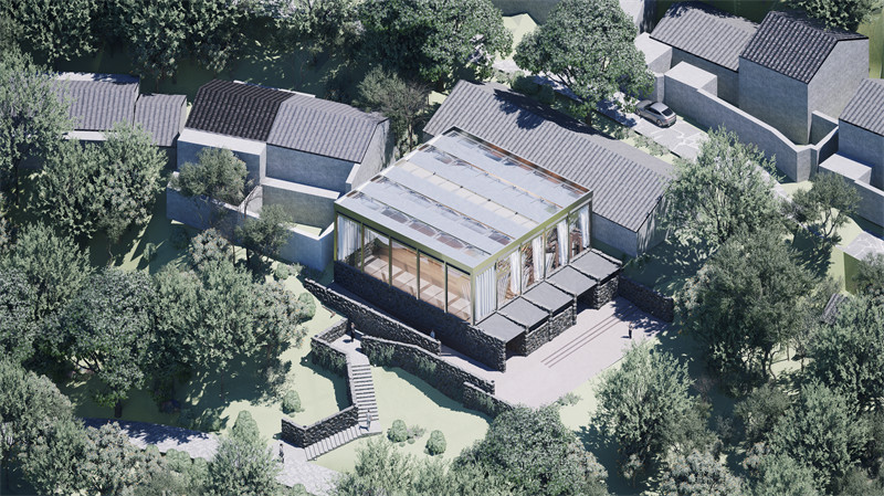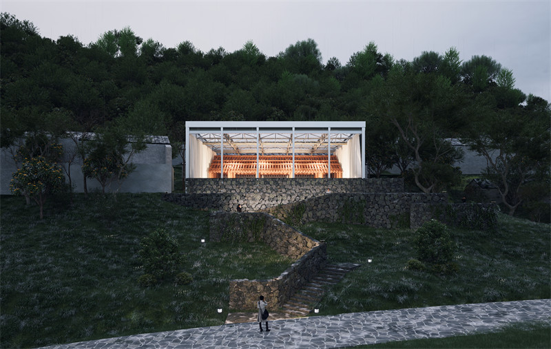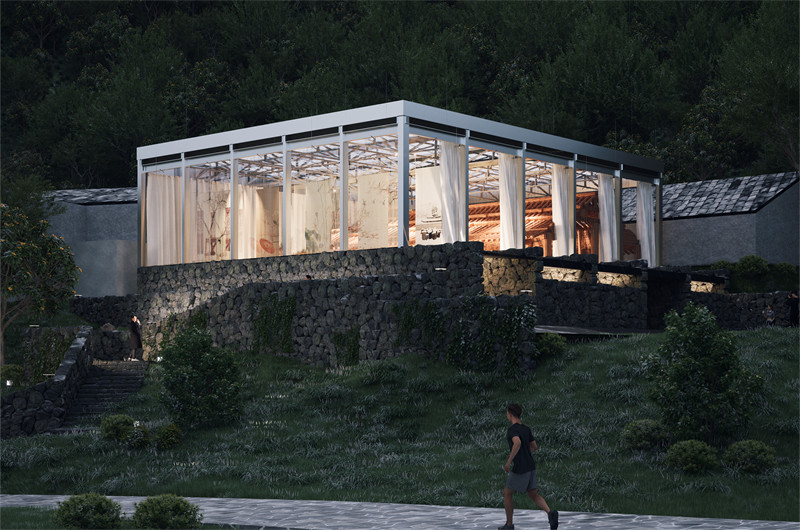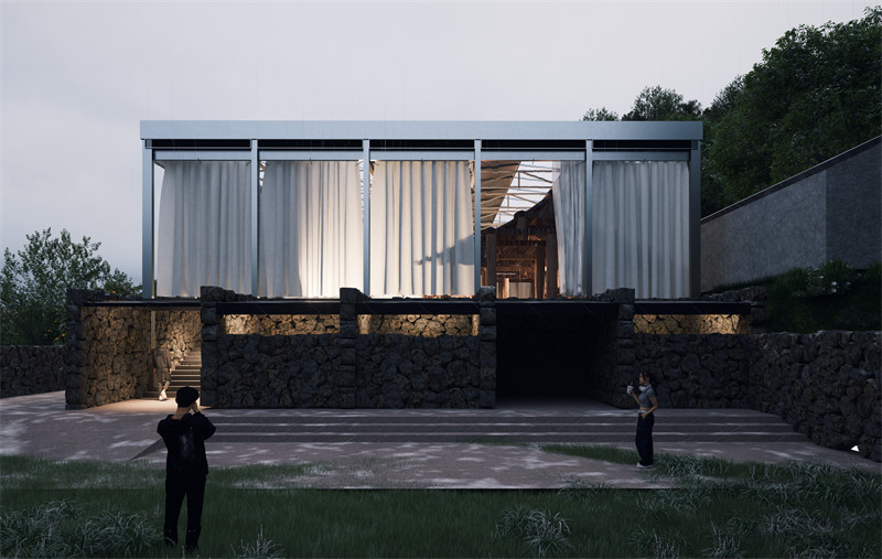 场地位于南北两侧具有高差的村道之间,旧祠堂西侧有一条连接两条村道的山坡小路。为最大限度恢复传统居民建筑遗产并凸显其与新增建筑强有力的视觉冲击,保留建筑原有结构,置入玻璃框架并形成山坡交通体系,串联整个建筑空间与周边场地,提供多个历史文化体验和展览空间,为整个场地注入全新活力。