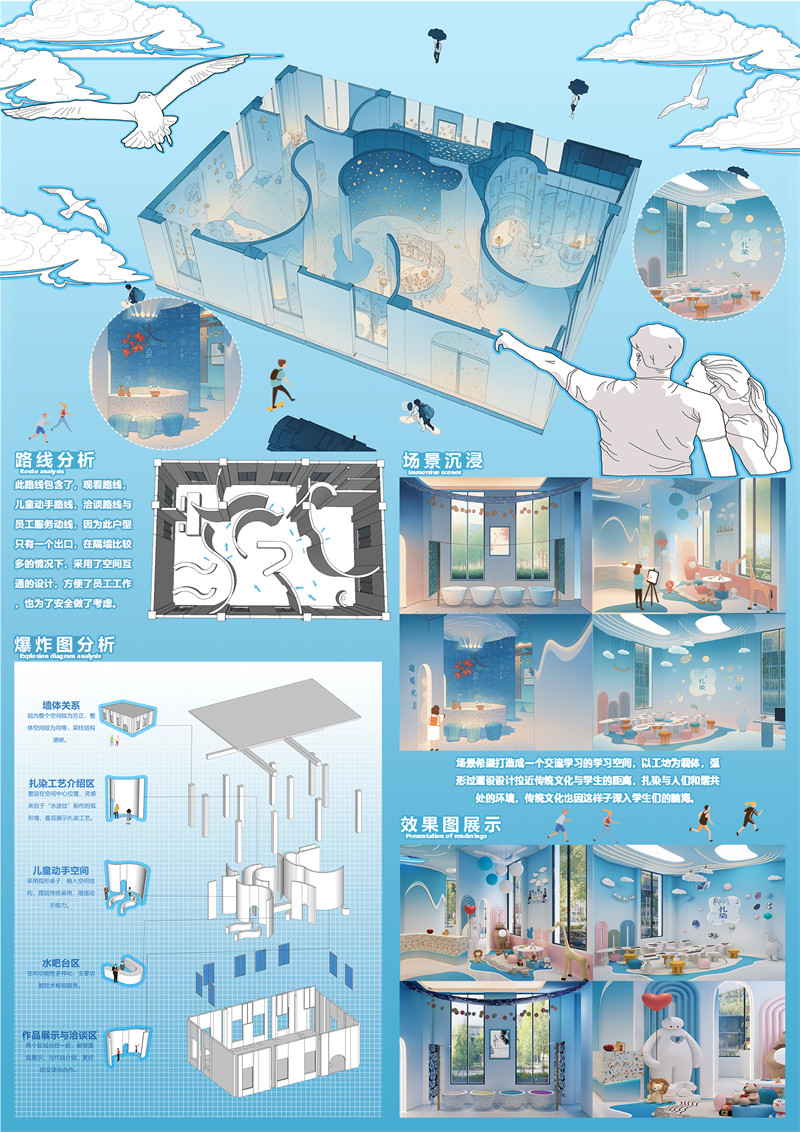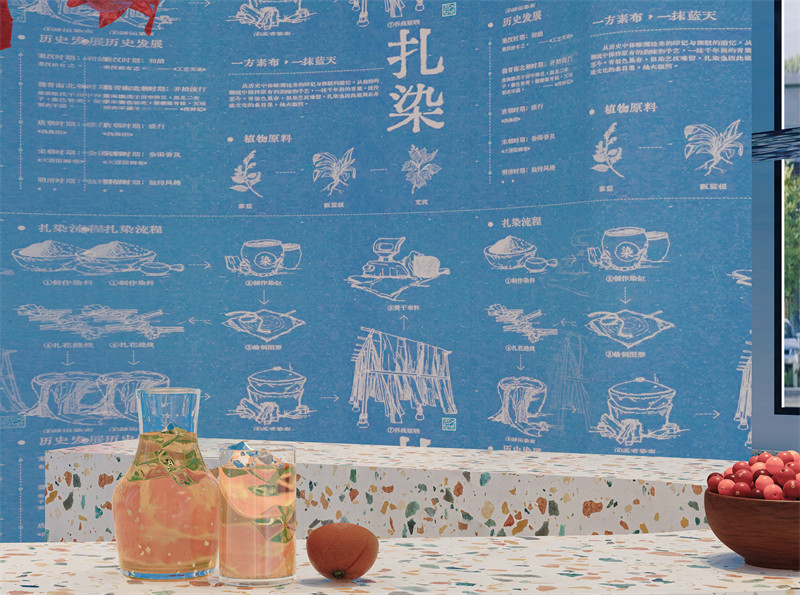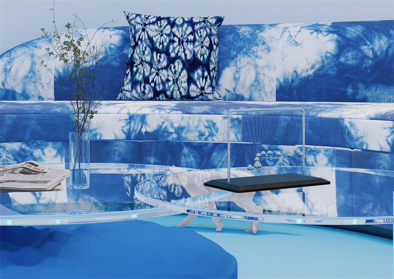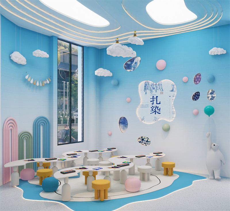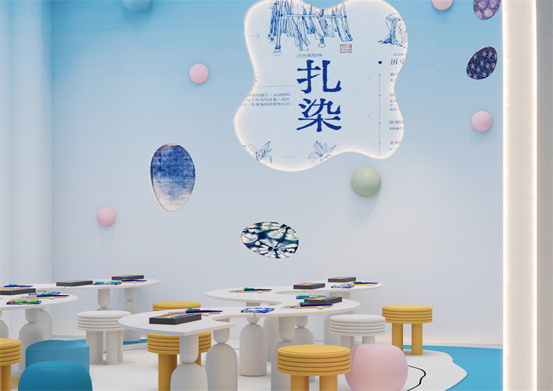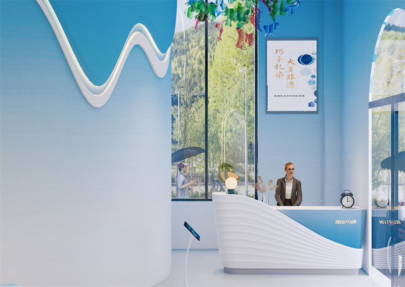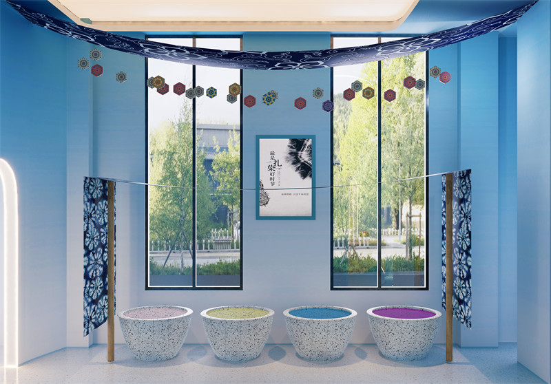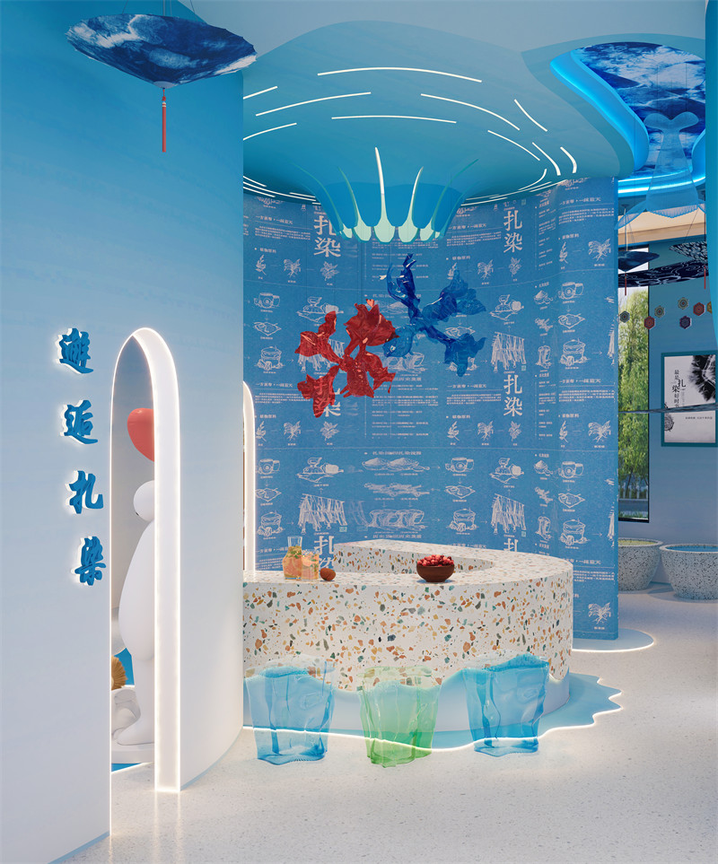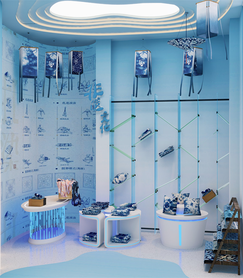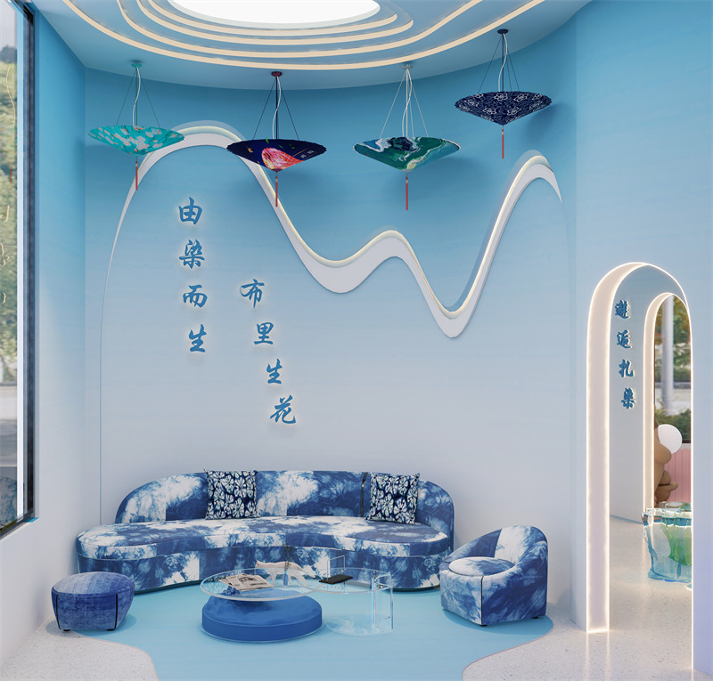 色彩:整体空间以浅蓝色为主,契合扎染文化。