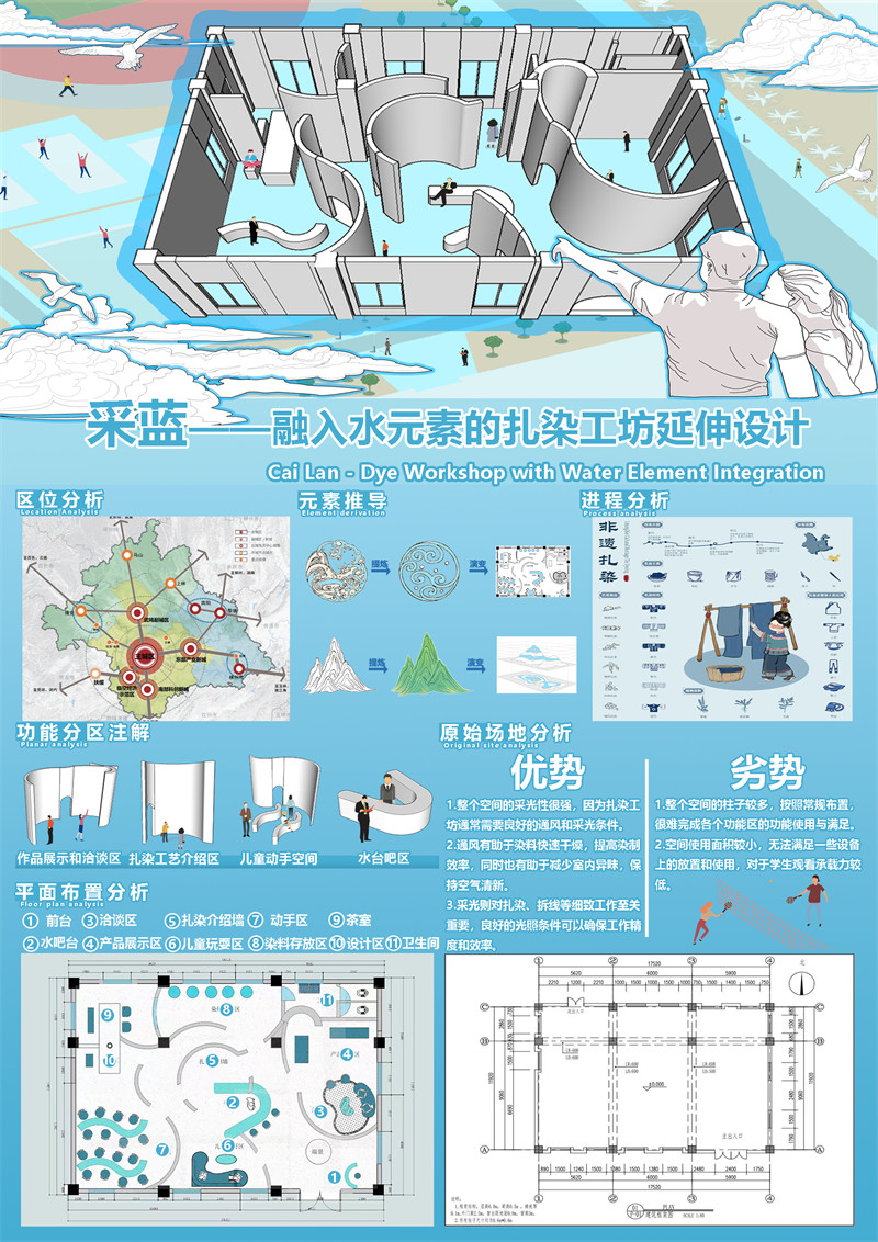 2.作品名:《采蓝 – 融入水元素的扎染工坊延伸设计》。