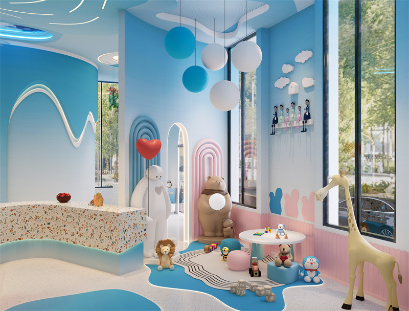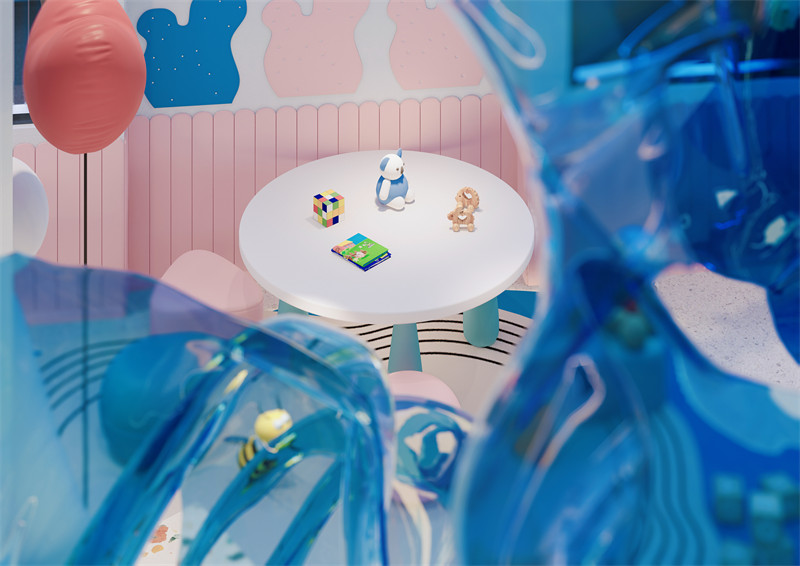 此户型融入水元素,通过曲线设计营造出一种神秘视觉感的工作坊,让儿童们带着一颗好奇的心去逛工作坊,让里面的展品多了一份神秘感,此工作坊围绕“水 山”的手法布局,以中心圆为中点何外扩散,层层环绕,用石英石材质与白蓝色的肌理乳胶漆明的对比带来强烈感官冲击,把大自然带到工作环境中,所谓看山不是山,看水不是水,户型内设有前台,水吧台,儿童动手区,作品展示区与治谈区,扎染工艺介绍区染料存放区,空间区域多样化,区域动线层层串联,解决了户型不会因为隔墙问题导致区域性的局限性,打造一个能够满足儿童学习玩耍促进扎染文化交流与产品出售,满足空间延申设计多样化。