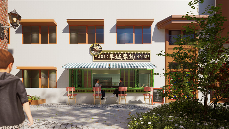 在“慢品生活”段,我们主要运用了柚木、青砖、满洲窗和壁画等叙事要素,业态则主要以咖啡店、潮玩店和创意园等新兴业态为主。同时,我们还营造了榕下休闲空间,打造出了漫品生活的叙事路径,营造出悠闲、轻松惬意的空间叙事氛围。