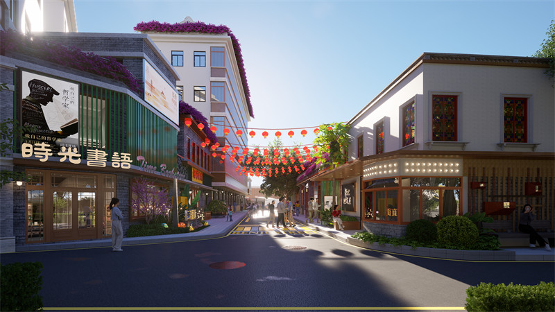 在“慢步归港”段,我们主要运用了红砖、趟龙门、青砖和异木棉等叙事要素,打造出了漫步归港的叙事路径。此段建造为最大的街道活动空间,人们在这里交流互动,尽显人情温暖和温馨的叙事氛围。