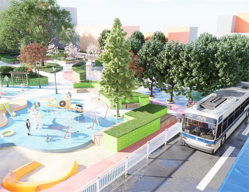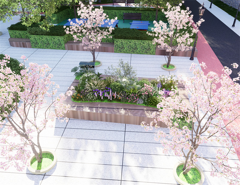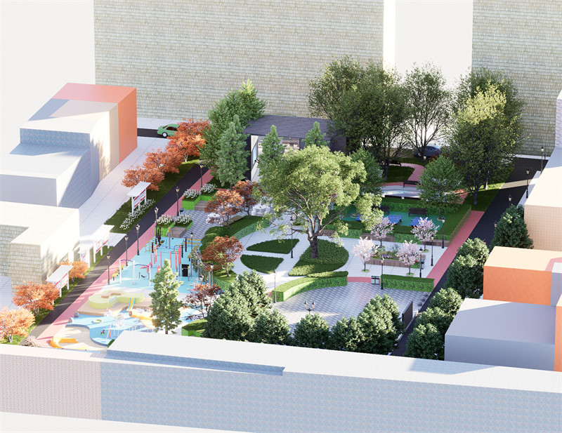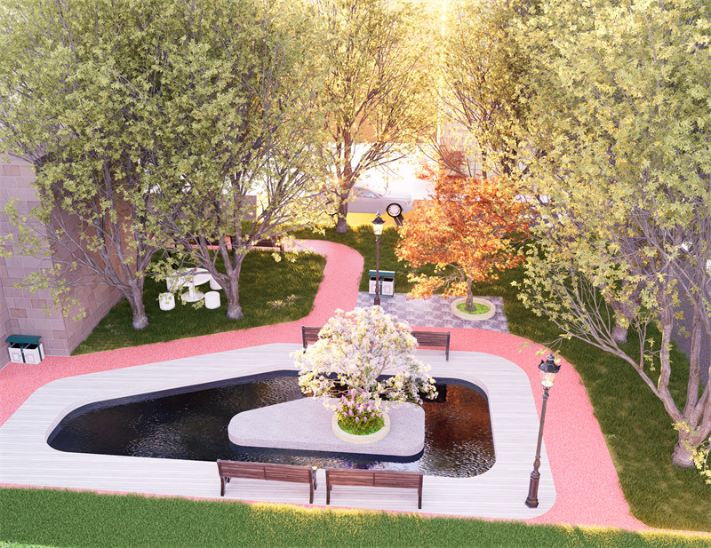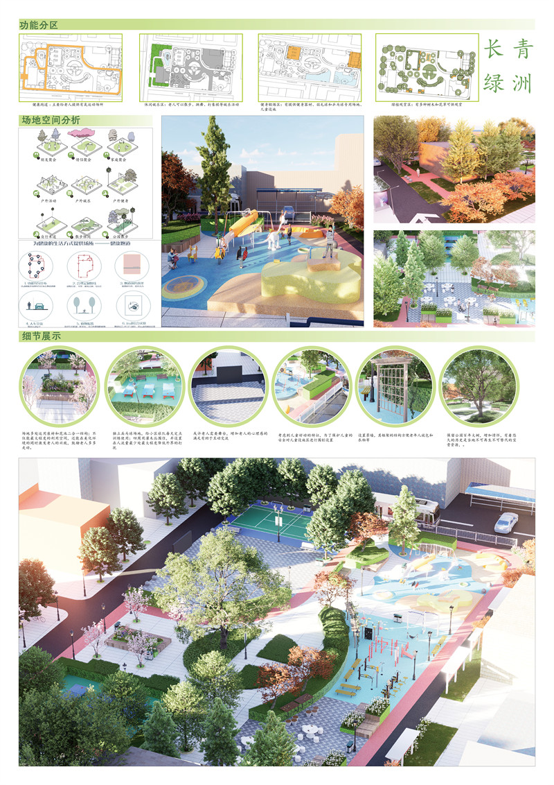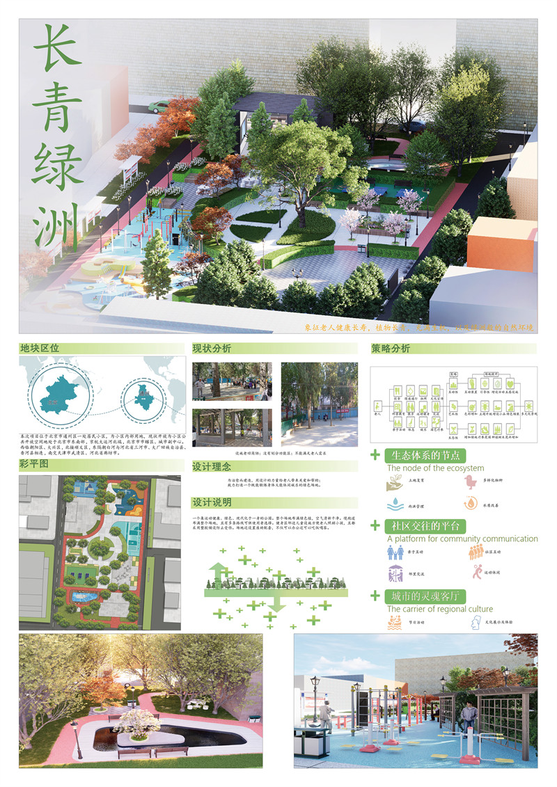 为治愈而建造,用设计的力量给老人带来关爱和帮助。“长青绿洲”象征老人健康长寿,植物长青,充满生机,以及绿洲般的自然坏境。是一个集运动健康、绿色、现代化于一身的街道公园。整个场地布满绿色植物,空气清新干净。公园总共划分为四个功能区:健康跑道(给老人提供有氧运动场所)、休闲娱乐区(可以散步,跳舞,打象棋等娱乐活动)、健身锻炼区(有提供健身器材、羽毛球和乒乓球专用场地,儿童设施)、绿植观赏区(有多种树木和花草可供观赏,林荫漫步)。为健康的生活方式提供场所——慢跑道布满整个场地,且有多条路线可供使用者选择且活动和休息场地均匀分布在跑道两侧。跑道颜色使用橙红色可以提升活力。人车分流保证运动安全。植物配置选择生长旺盛,叶量大光合作用强的植物。跑道结合24节气知识,供运动者阅读认知。健身区邻近儿童设施方便老人照顾小孩,并且都采用塑胶铺设防止受伤。考虑到儿童好动的性格,对儿童娱乐区进行了围栏装置加强了场地安全性。场地还多处设置配套座椅,不仅可以办公还可以吃饭喝茶。有部分座椅和花池采用二合一组合,不仅能最大的程度的利用空间,还能美化环境的同时激发老人的兴致,边赏花边休息鼓励老人多多走动。有独立的乒乓球专用场地,供小区球队每天定点训练使用;四周用灌木丛围住,并设置在人流量最少处,最大程度降低外界的打扰。或许老人需要舞台,增强老人的心理感的满足有助于互动交流。老人健身区设置景墙,其框架的结构方便老人放包和衣物等。公园的中心保留了百年大树,增加情怀,有着悠久的历史是当地不可再生不可替代的宝贵资源。增设一条小湖,为空间注入自然的力量,让人感受到宁静和平静。流水潺潺、水波荡漾的声音有助于营造放松的氛围。水体还可以反射周围的景色和建筑,创造出镜面的倒影效果,增强空间的深度感和层次感。小湖周围铺设塑木地板,能经受住风吹雨打和游客频繁踩踏,同时为人们提供舒适的行走体验。塑木地板不易腐蚀,能够长久保持良好的状态。建设在水体附近,不仅防滑,能有效保障人们在湿滑环境中的行走安全,而且不会因为长期接触水而受损。