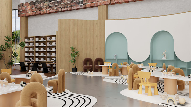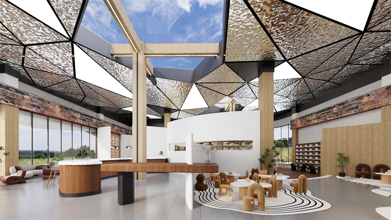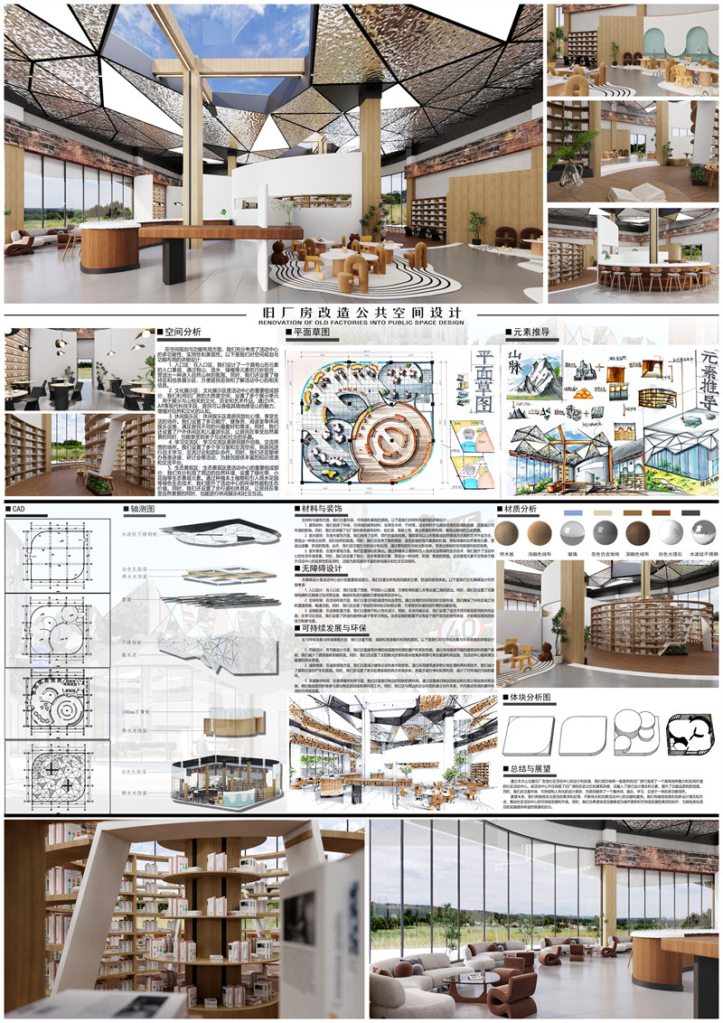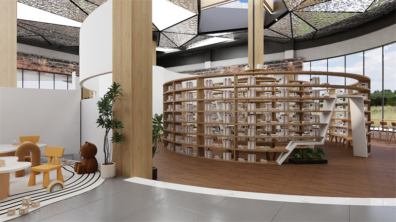 空间布局与功能规划:①入口广场:设置标志性的入口景观,如雕塑、水景等,吸引人们的注意力和兴趣。 ② 展览区:利用厂房的大空间优势,设置艺术展览区,展示当地艺术家的作品和社区的文化活动成果。③阅读区:设置舒适的阅读环境和丰富的图书资源,为社区居民提供一个安静的学习和交流空间。④ 亲子活动区:设计适合儿童和家长的亲子活动区域,如手工制作区、游乐设施等,增进家庭成员之间的互动和感情。