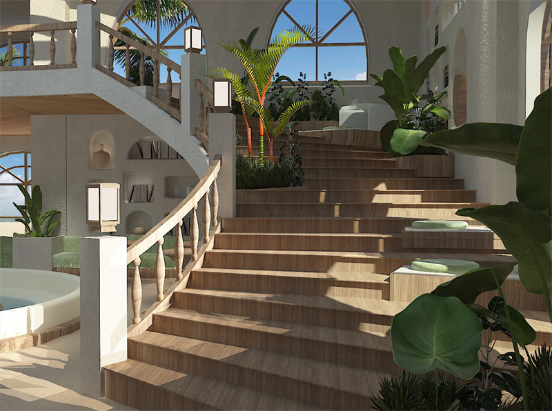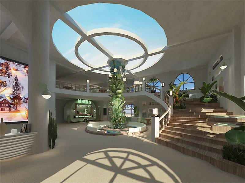在建筑规划上,我们充分尊重了废弃房屋的原有结构,通过巧妙的设计手法,将“树”的形态与空间布局相结合,形成一个既具有现代感又不失自然韵味的整体。空间中央的核心装置艺术,形态上模拟树的挺拔与繁茂,细节上融入由树叶形态演化而来的吊灯,两者在光影交错间形成视觉上的和谐共鸣,极大地增强了主题元素在空间内的艺术感染力与表现力。