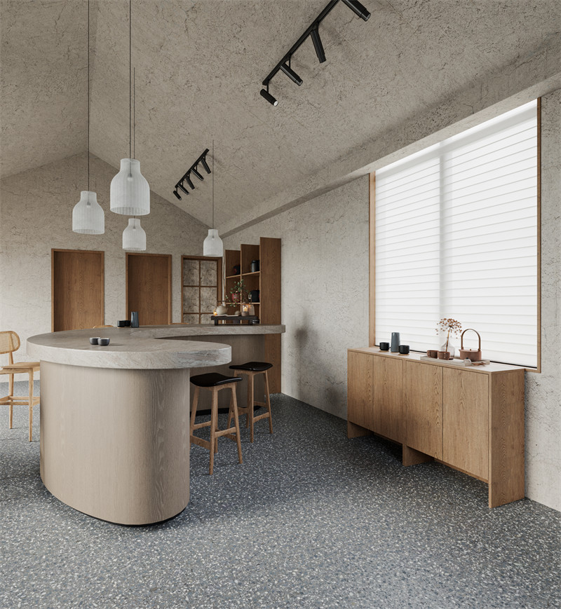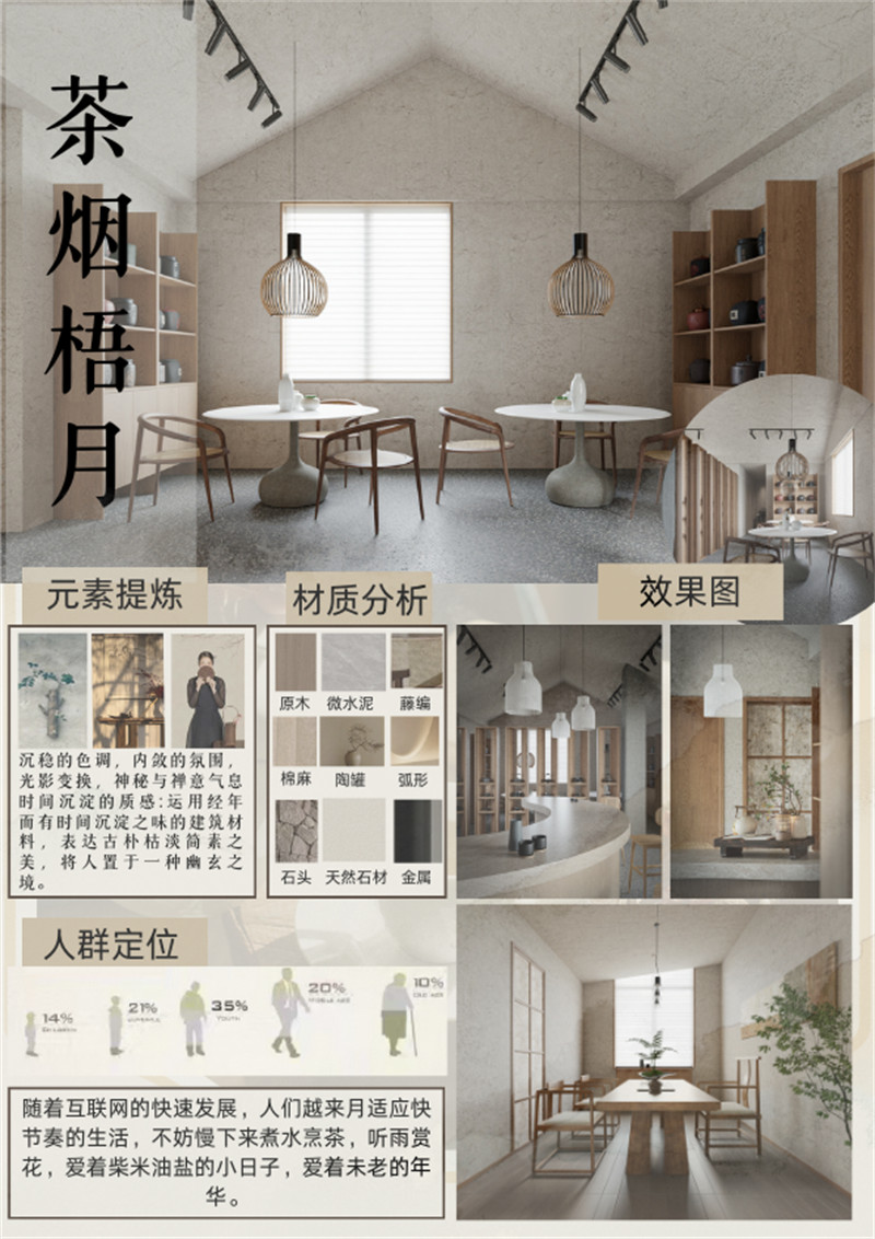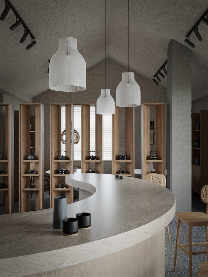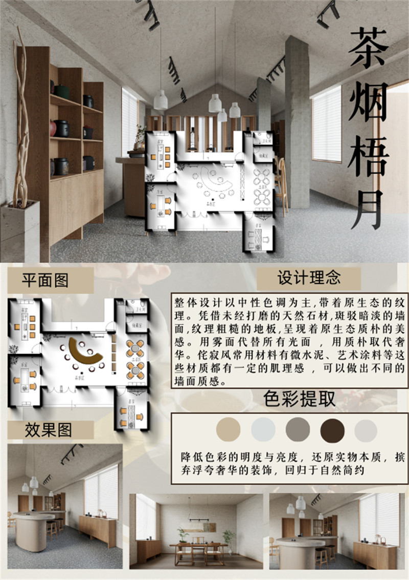 本设计以“侘寂之美,禅意生活”为核心理念,旨在通过侘寂风格打造一个简约、自然且充满禅意的品茶空间。侘寂风强调自然、朴素和不完美的美,这种美学理念与茶文化的精髓不谋而合。
