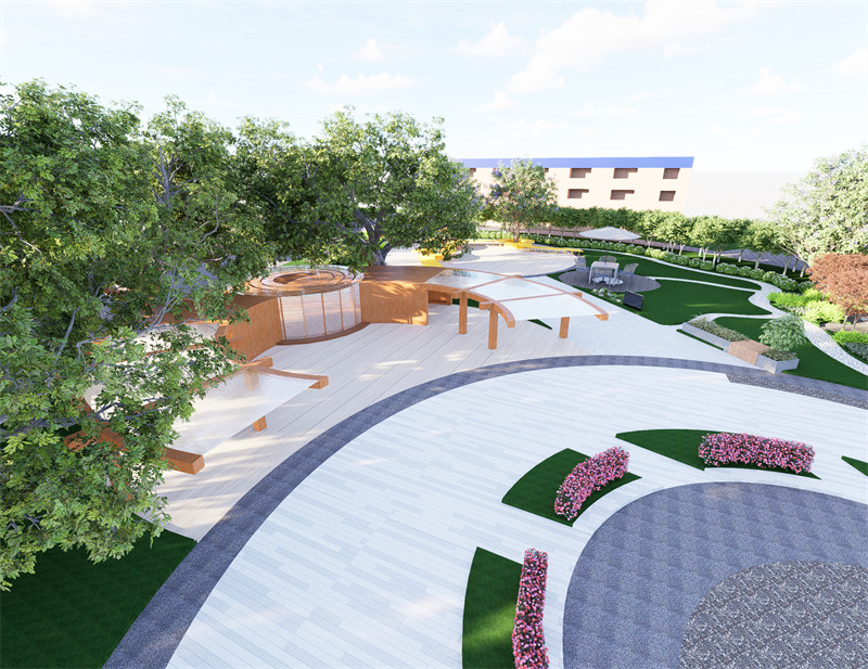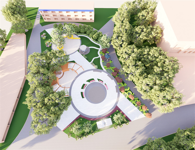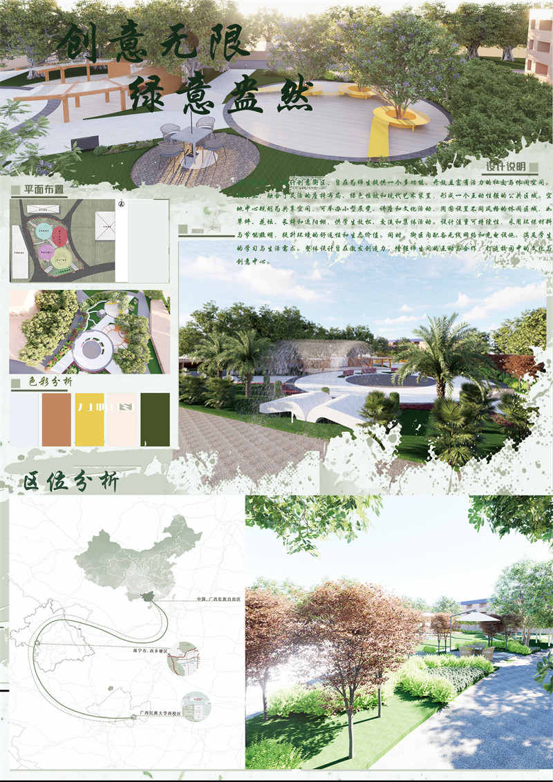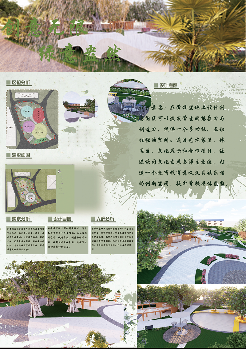 本公园以“创意无限,绿意盎然”为主题,以绿色生态为基础,结合现代设计理念,创造一 个具有启发性和互动性的校园绿地空间。通过设计具有吸引力的景观和设施,鼓励人们在这里交流思想、激发创意、放松身心。