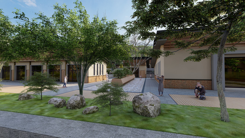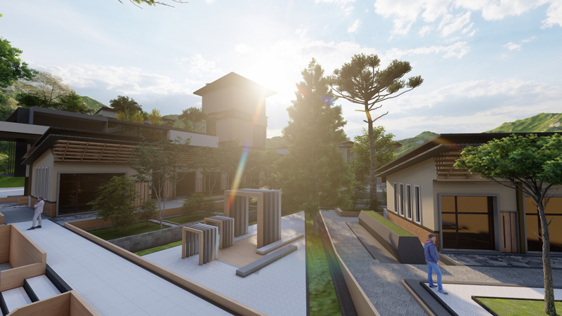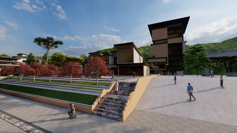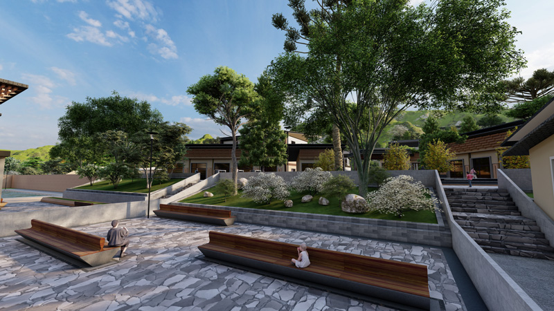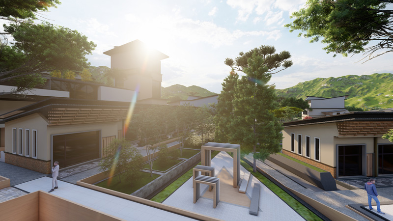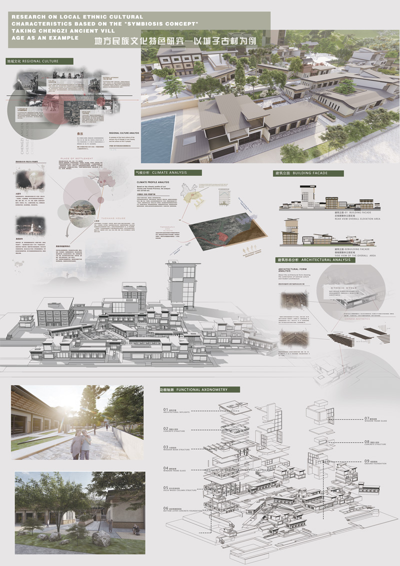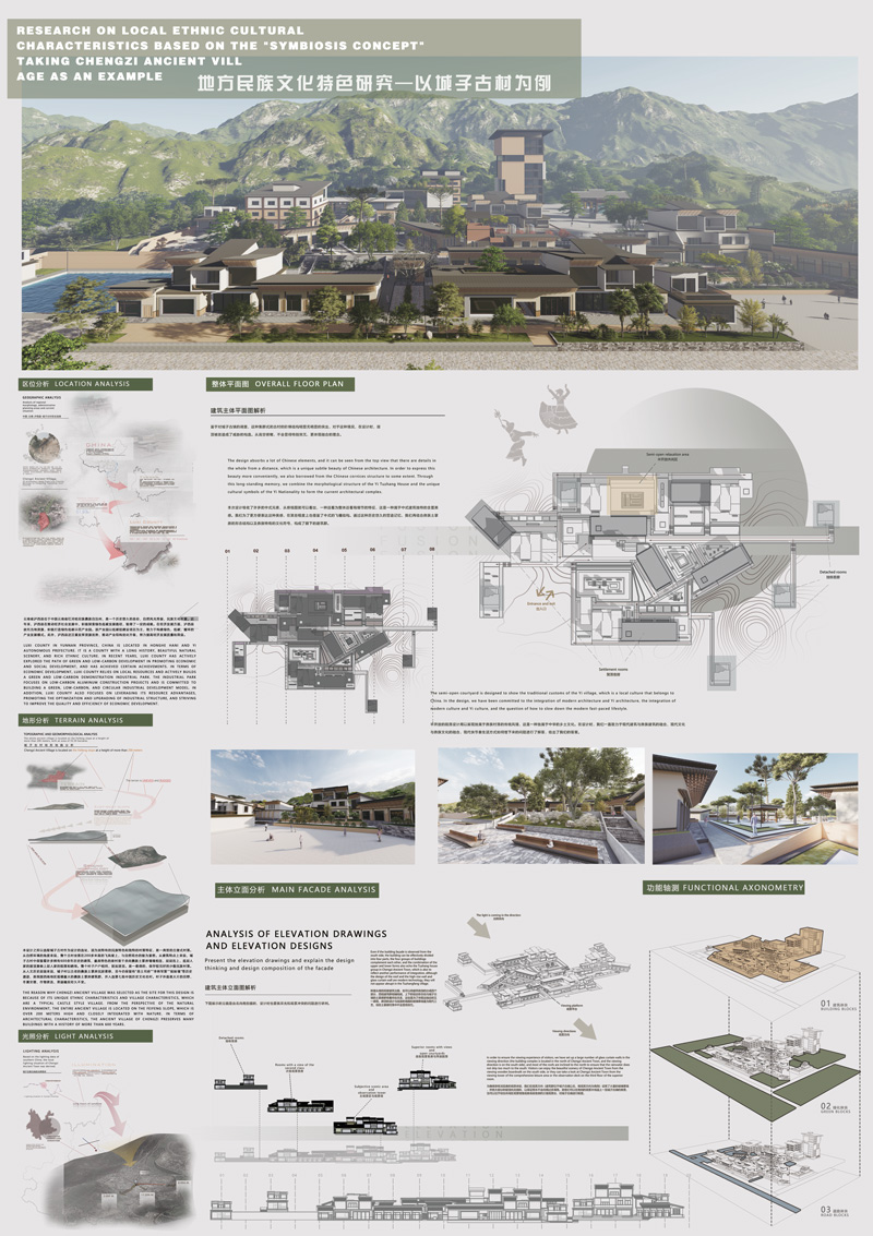 3.设计理念及思路:本设计以云南城子古村为选址,通过对其自然环境特征以及民俗文化的分析与归纳,对古村的建筑以及公共空间的景观进行改造,保留和修复具有历史意义的建筑物。设计吸收了许多的中式元素,拥有中式建筑独特的含蓄美感,使建筑远看为整体近看有细节,在建筑造型的设计上尊重古村原有的建筑风格和结构,借鉴了中式飞檐屋面结构并结合彝族特有的文化构成建筑群。考虑到当地的气候和降水量,将屋面设计成倾斜式,可以有效组织屋面排水。根据光照的分析 最后选择在设计中将建筑的屋檐进行延伸,可以有效为使用者提供日照遮阳效果。在延续传统的同时结合现代设计理念进行改造,提升居住舒适度和功能性。