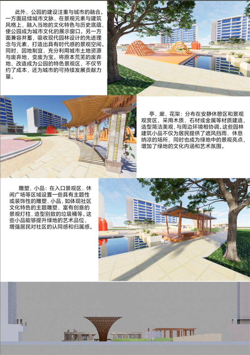设计上秉持简洁、大方、便民的理念,以“人与自然”为核心主题思想。从过去单纯关注绿化景观的美观性,转变为聚焦于绿化景观使用者的体验感。通过人性化的设计,如合理设置休息长椅、便捷的公共卫生间、清晰的指示标识等,让人们在公园中能够便捷地享受各种设施与服务。将这种在公园中获得的愉悦感,升华为一种独特的审美意象,使人们在欣赏自然美景的同时,也能感受到设计的用心与关怀,真正做到设计为人、以人为本。