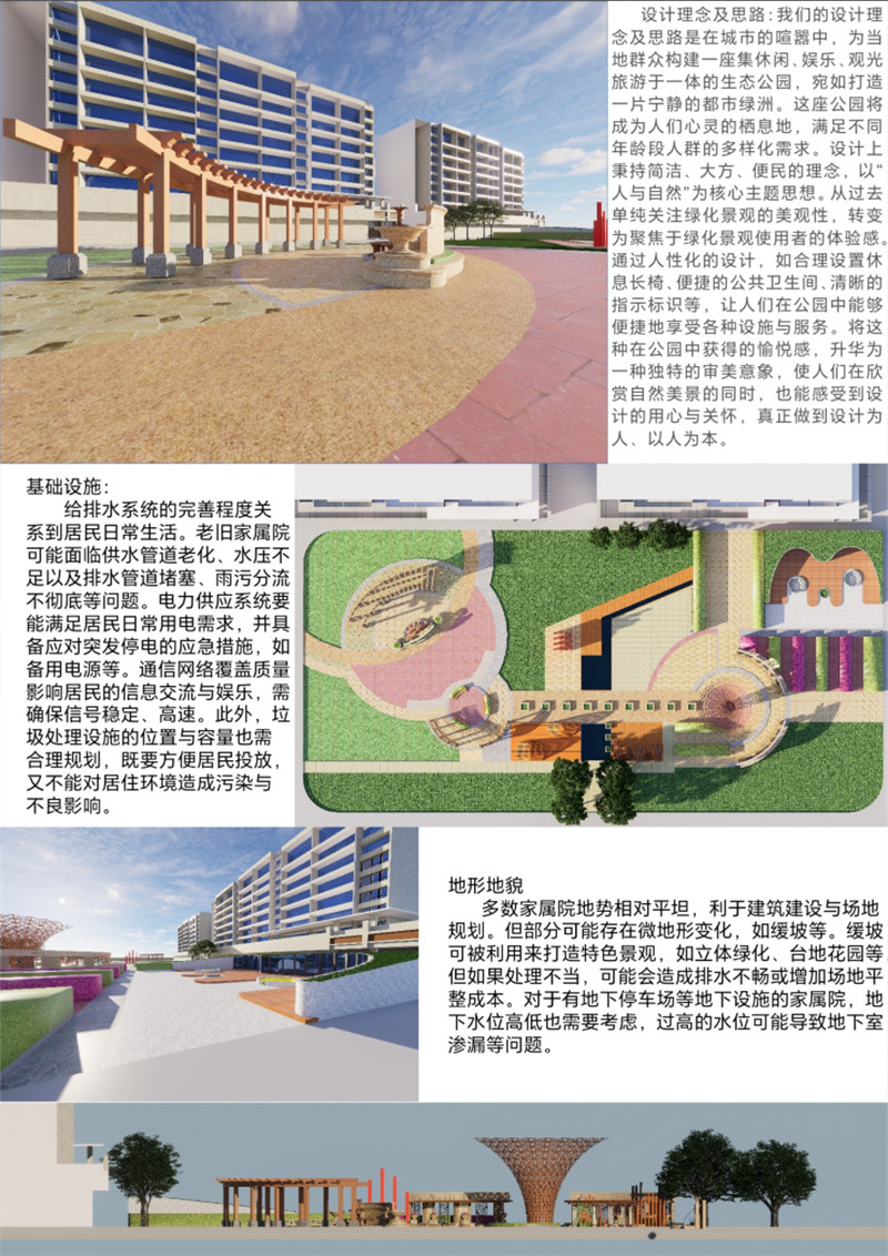 在城市的喧嚣中,为当地群众构建一座集休闲、娱乐、观光旅游于一体的生态公园,宛如打造一片宁静的都市绿洲。这座公园将成为人们心灵的栖息地,满足不同年龄段人群的多样化需求。所选场地的具体位置是在我们学校家属院旁边一块空闲绿地