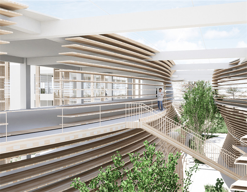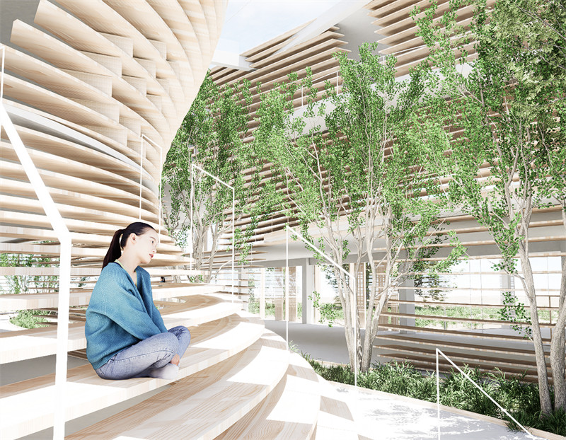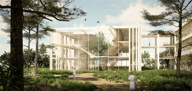 首先,设计充分考虑到基地所在的优美自然环境,南面毗邻金水河,周围绿树成荫,生态环境得天独厚。这一独特的地理优势为设计提供了无限灵感,设计团队决定以“引入自然”的理念作为设计的核心出发点,力求将建筑与自然环境紧密结合。通过精心的空间布局和景观设计,设计不仅希望让建筑本身成为自然的一部分,更希望通过自然元素的引入,创造一个舒适、开放且富有灵感的学习与阅读环境。