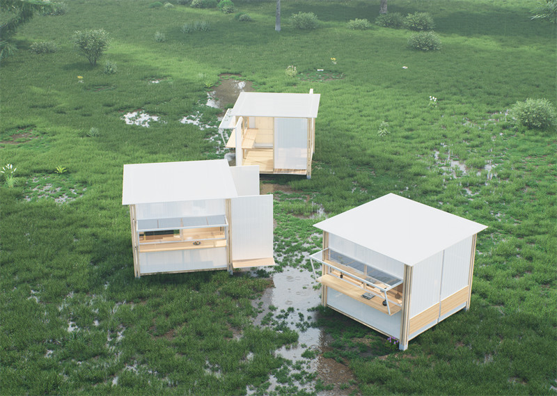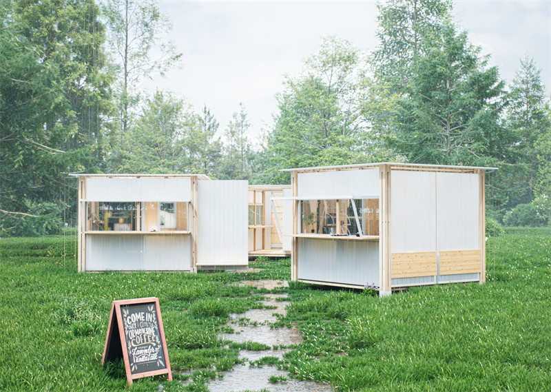 构造上在保证稳固的前提下,采用了中式传统的榫卯结构通过减少金属构件的使用以及木头、板材模数化的方式,使得学生也可以进行搭建使得建筑学子做到学以致用,融学于行的效果,同时模数化在木头和板件更有利于后期组件的替换与安装,兼顾实用的同时做到了绿色环保节能减排。