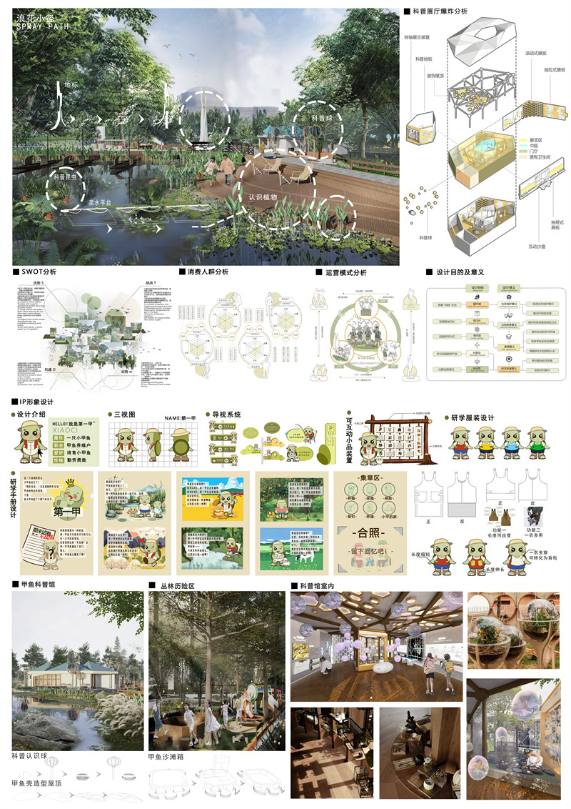 当小朋友们圆满结束这段难忘的研学之旅时,他们可以邀请家长和老师一同合影留念,将这份珍贵的瞬间贴在研学手册上,作为本次旅程的美好纪念。此外,我们还围绕龟龟这一IP形象,精心设计了直观易懂的导视系统、生动有趣的互动小品装置以及独具特色的研学服装,旨在为小朋友们营造一个更加沉浸、更加有趣的研学环境。