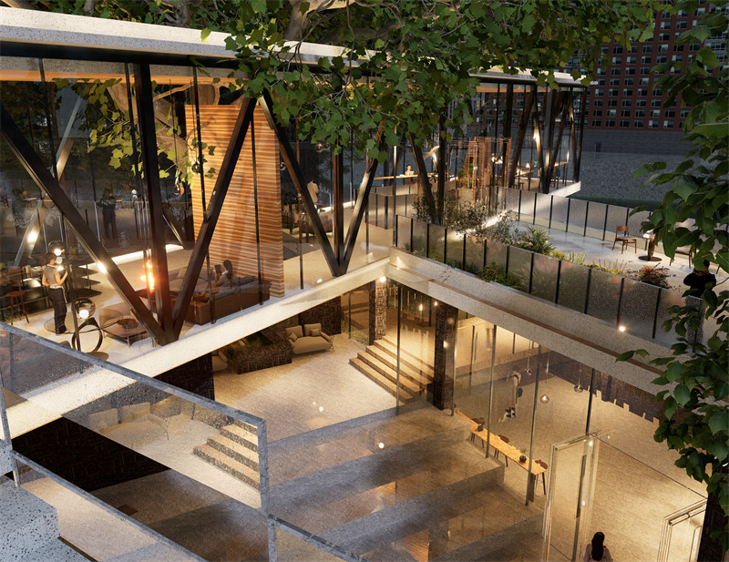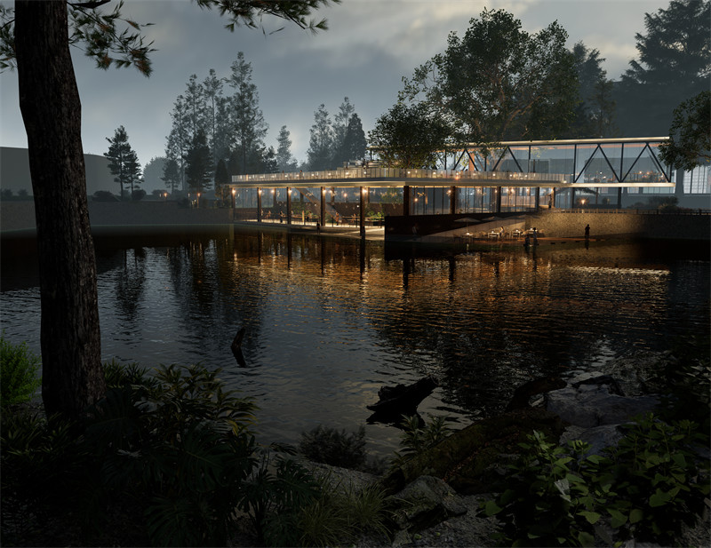 方案总体形态为几条长方形的交叠,在空间上回旋起伏,面向水面拓展景观面。一层下沉空间采用钢梁柱结构,简单干净。二层结构实际上与一层脱开,由两组钢桁架构成的一个长方体借助类似与桥基形态的柱基和两面承重墙支撑,使得大部分空间在人视角看来悬浮在空中。