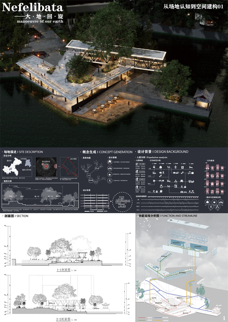 Nefelibata,葡萄牙语,活在自己想象和幻想中的人;指不遵循社会、文学或艺术传统的人。 在这里,大地是流动的空间,可以沉没,可以腾起,可以回旋。用不同于场地旧的平面化的空间形式,营造出从不同高度、不同位置、不同情感与湖水互动的社交空间。